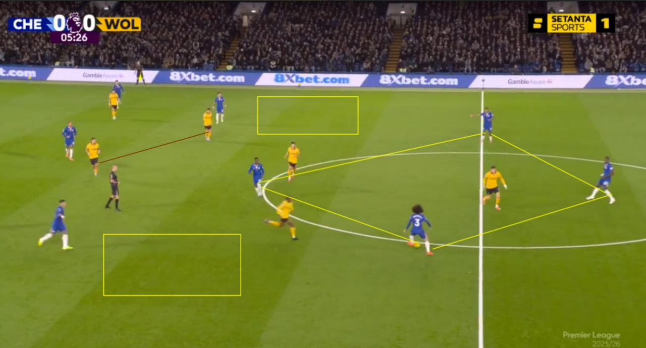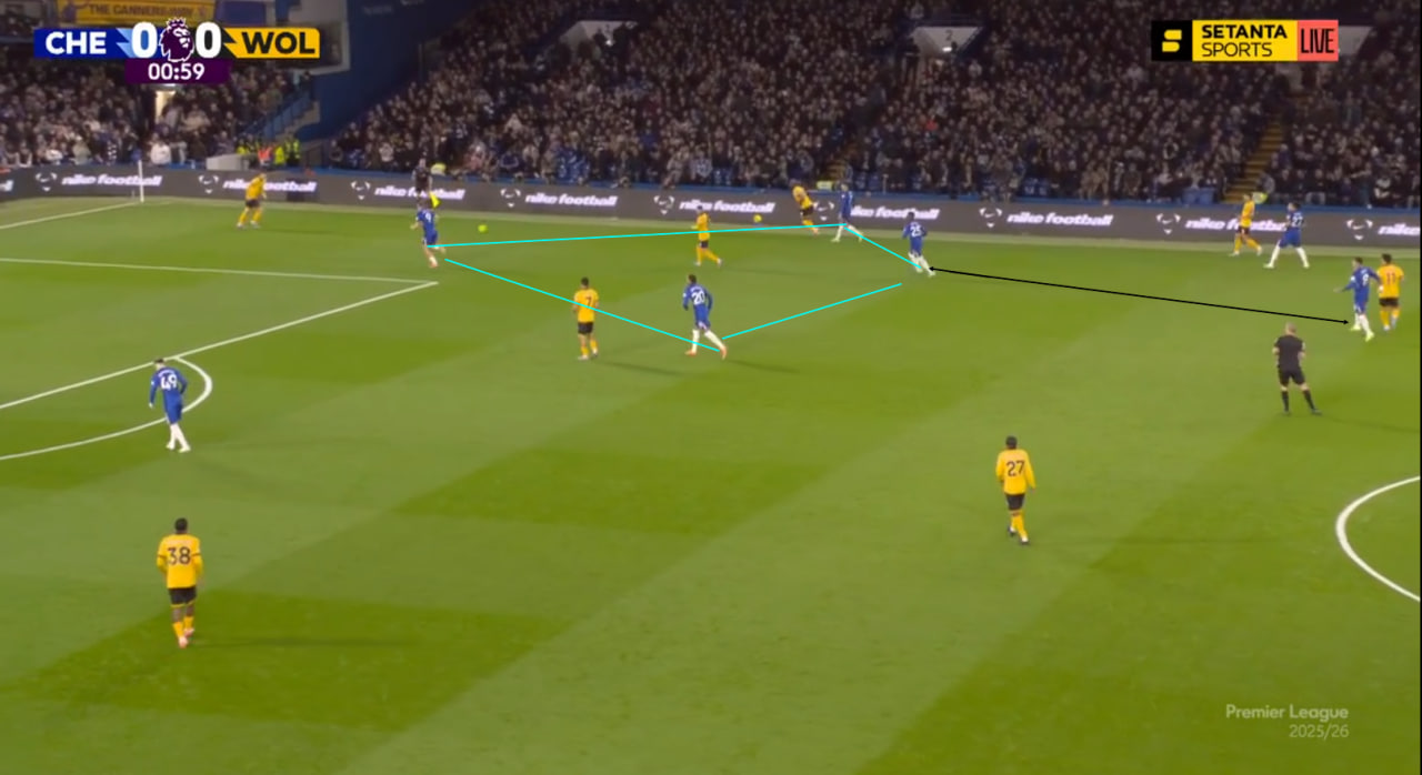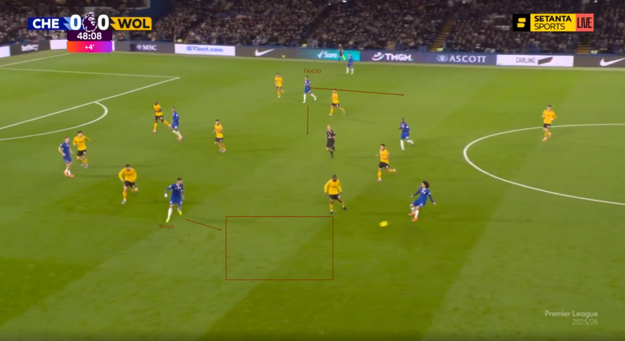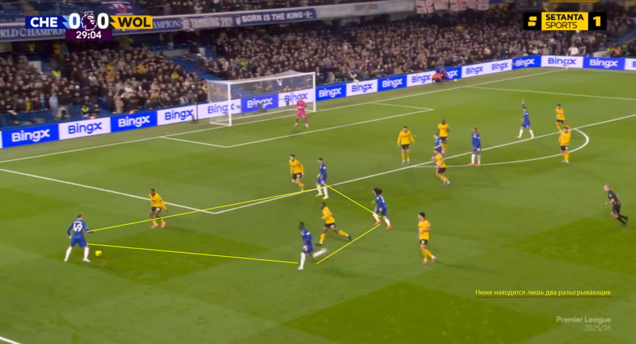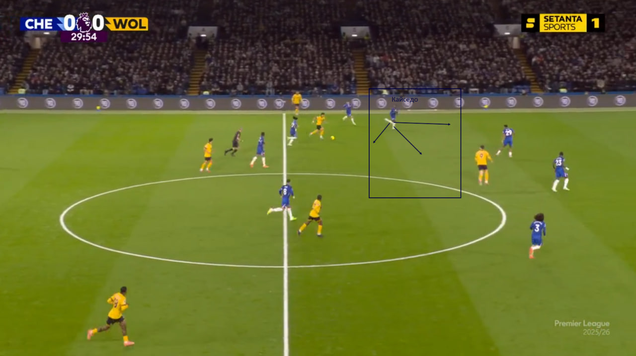 «Челси» располагался по схеме 3-3-1-3, структура была заточена на баланс на всех участках поля и вариативность исполнения, что не всегда получалось осуществить при плотной структуре «Вулверхэмптона», но в общем инструмент казался рабочим (при доработках — тем более). В зоне розыгрыша находились два центральных защитника + Кукурелья, который ситуативно мог подниматься и занимать более высокую позицию, меняясь с кем-либо ролями. В центре поля была видна определенная идея: растянуть компактную вариацию 2 игроками в полуфлангах (в блуждающих позициях), на подмогу розыгровщикам оставался регулярно лишь Кайседо, находясь под плотной опекой, играя промежуточную роль.