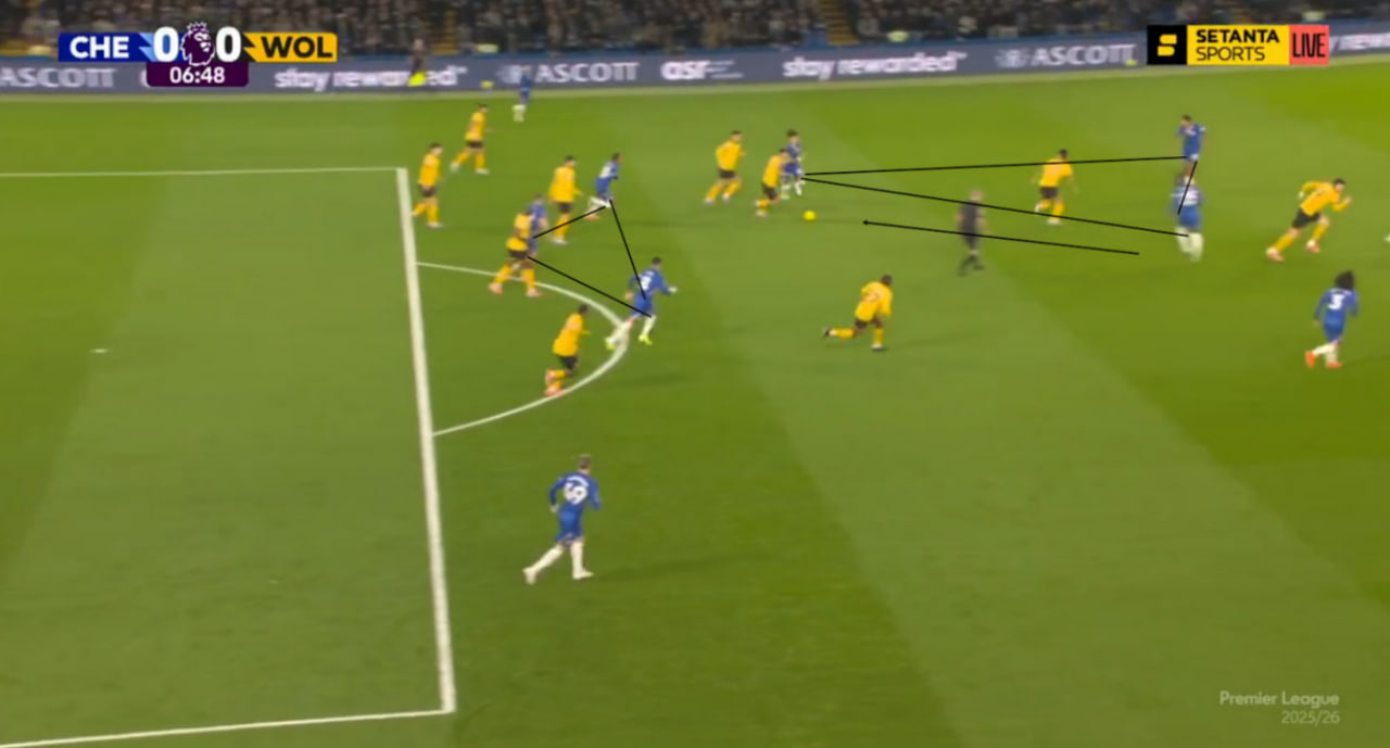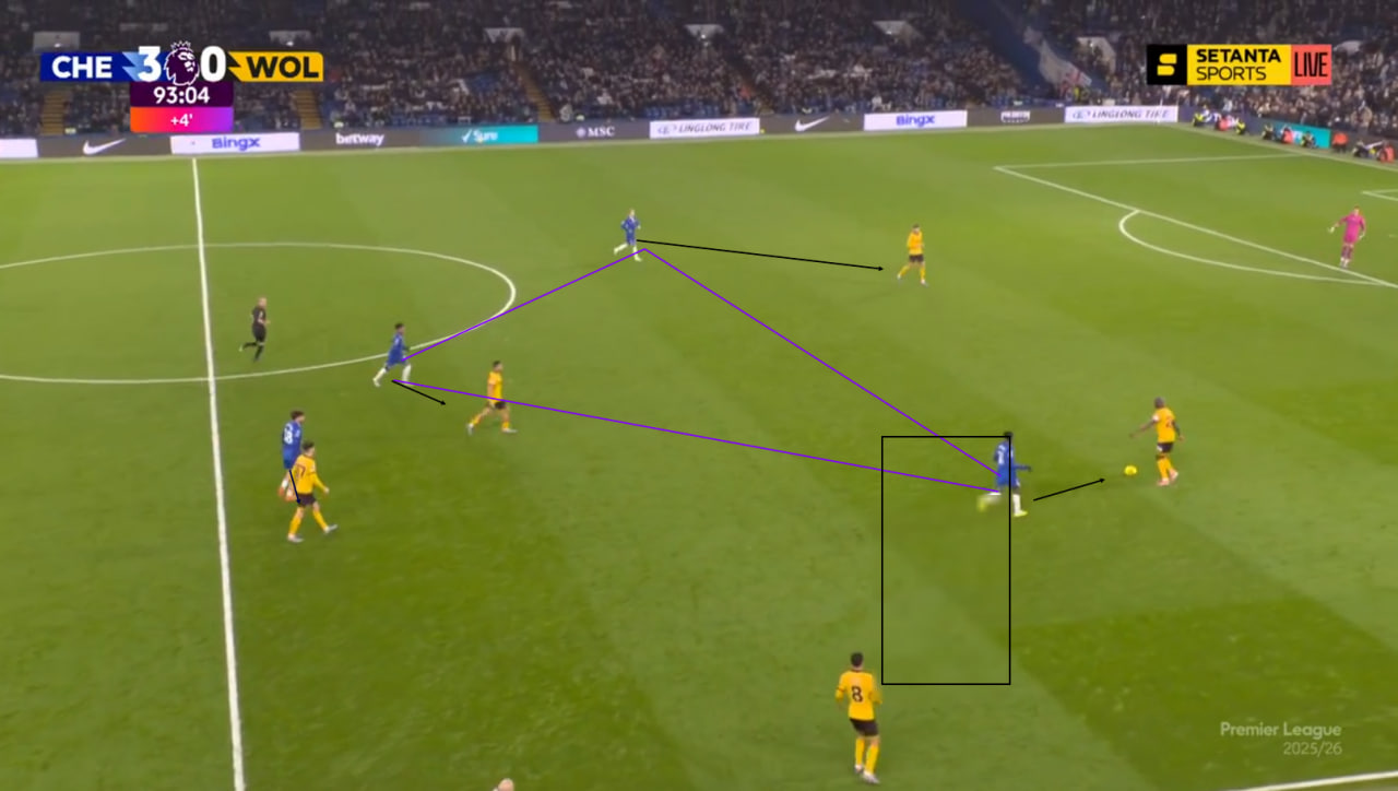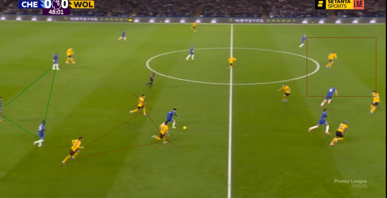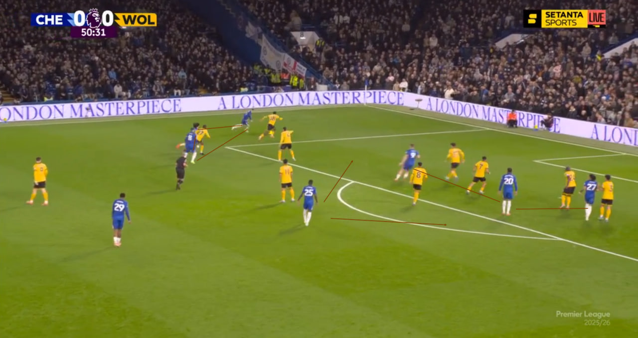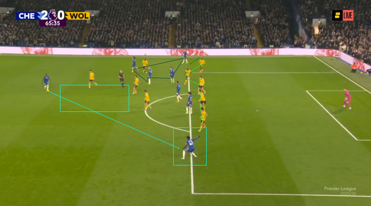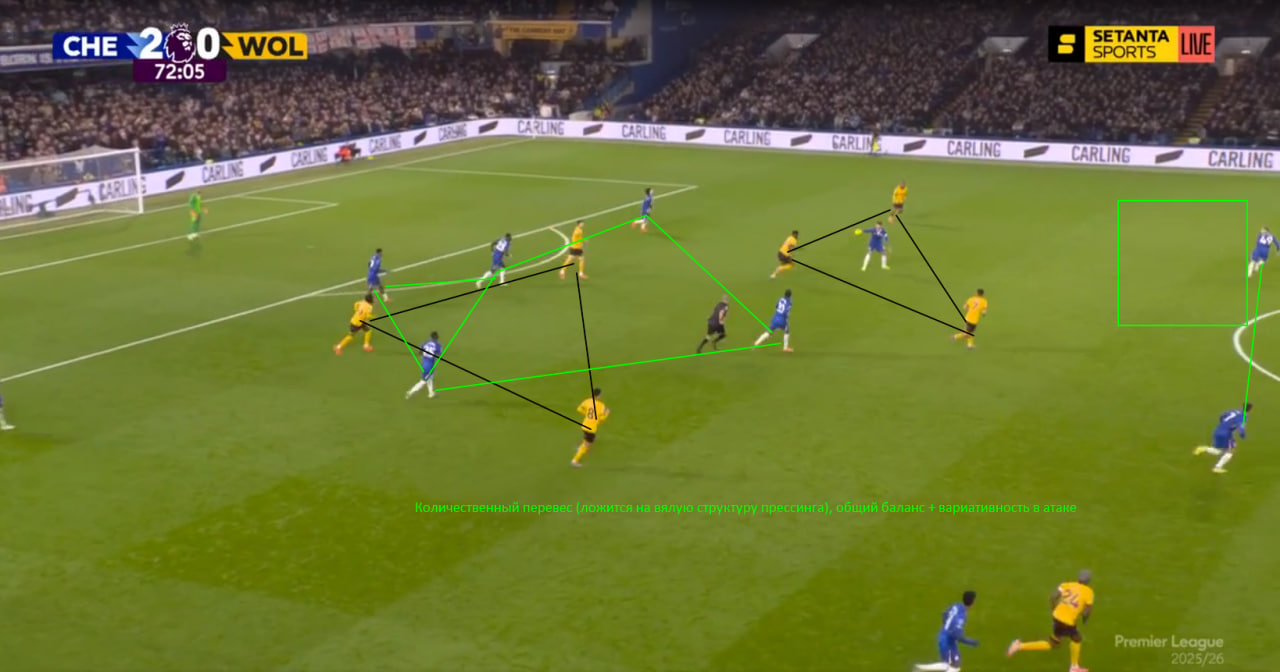 Это требовало от «Челси» более простое и где-то более удобное (для них самих) расположение: с переполнением штрафной определенным количеством, при вариативности в зоне мяча (на фланге) и малом балансе в вариации розыгрыша (ниже, уменьшилось количество), но в то же время с присутствием хаотичного расположения. Также у «Челси» был дополнительный козырь в лице уязвимости Вулверхэмптона: невнятная игра в переходах при прямолинейности структуры. Так и пришли забитые голы.