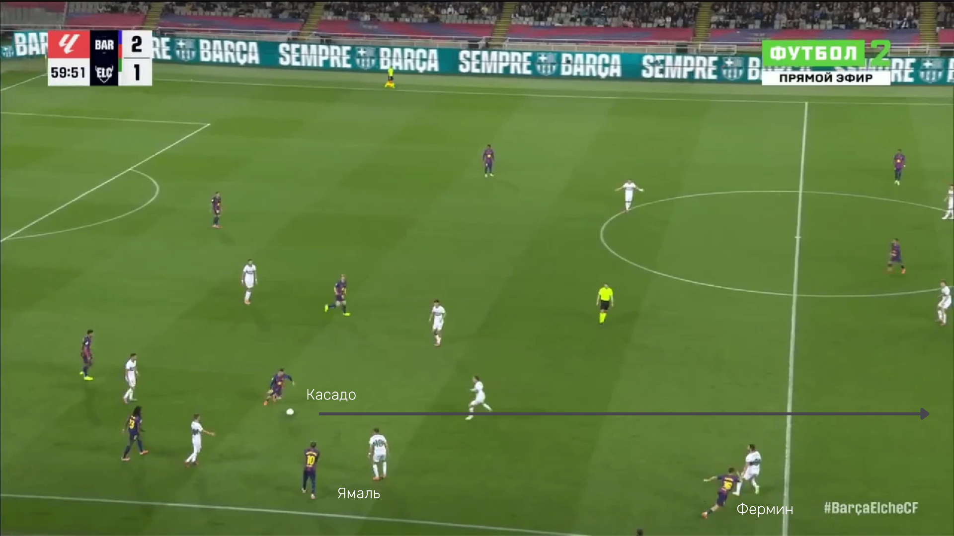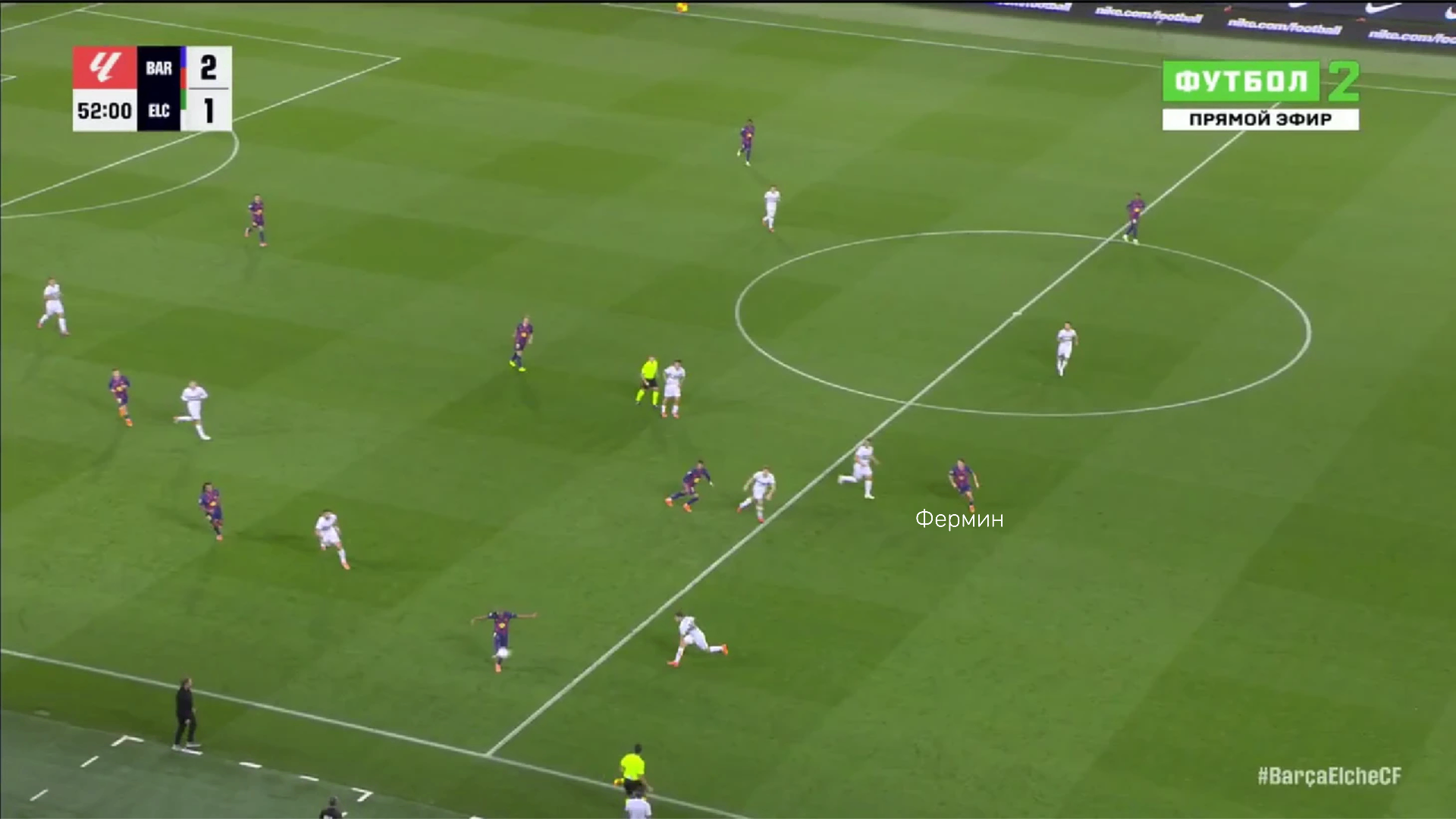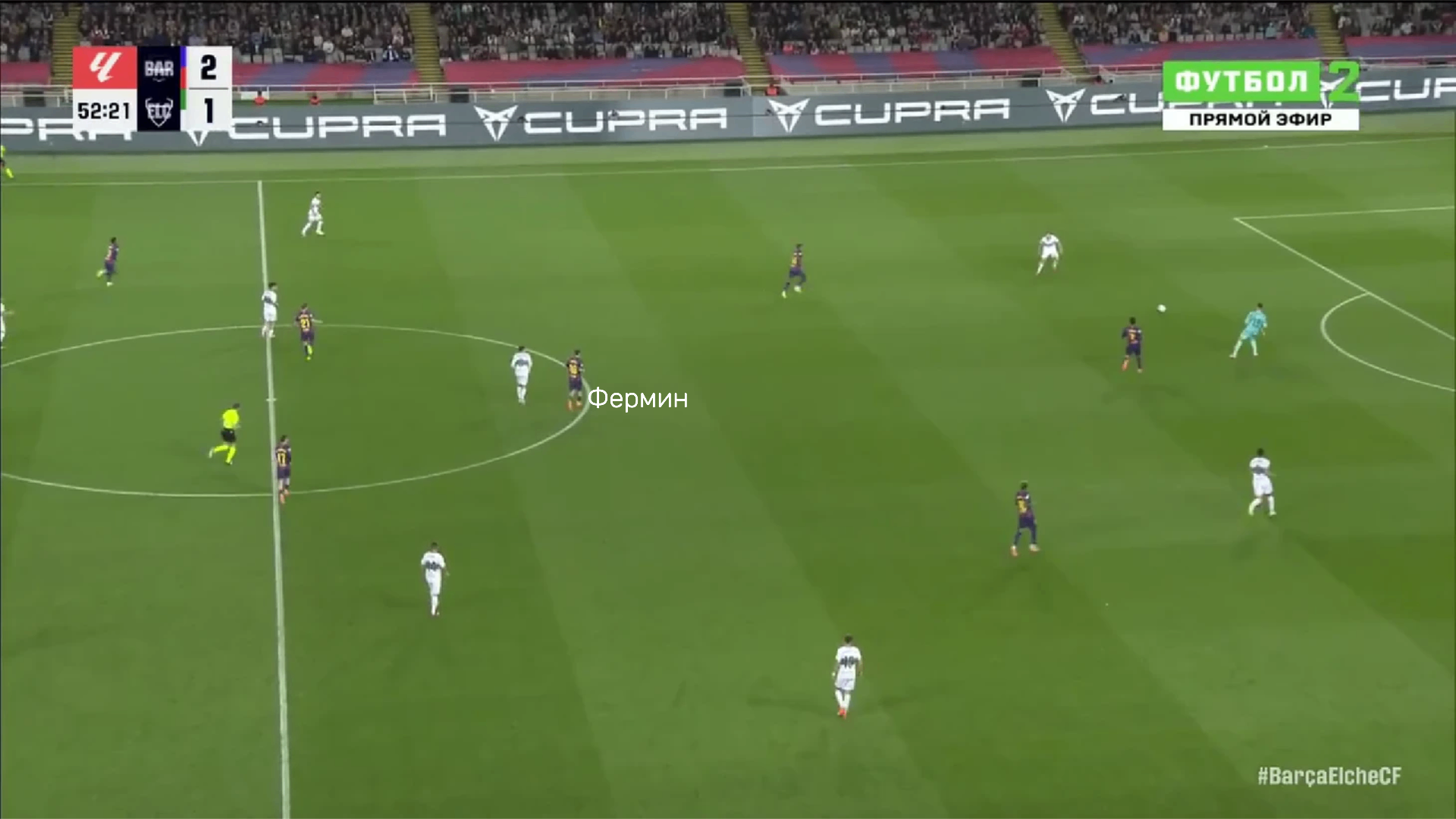 А здесь, Ямаль не сумел забить с передачи Фермина. Пере этим Лопес снова нашёл свободную зону за спинами оборонцев «Эльче».