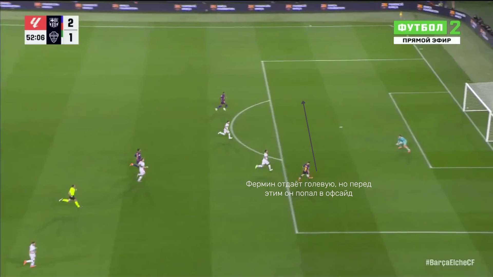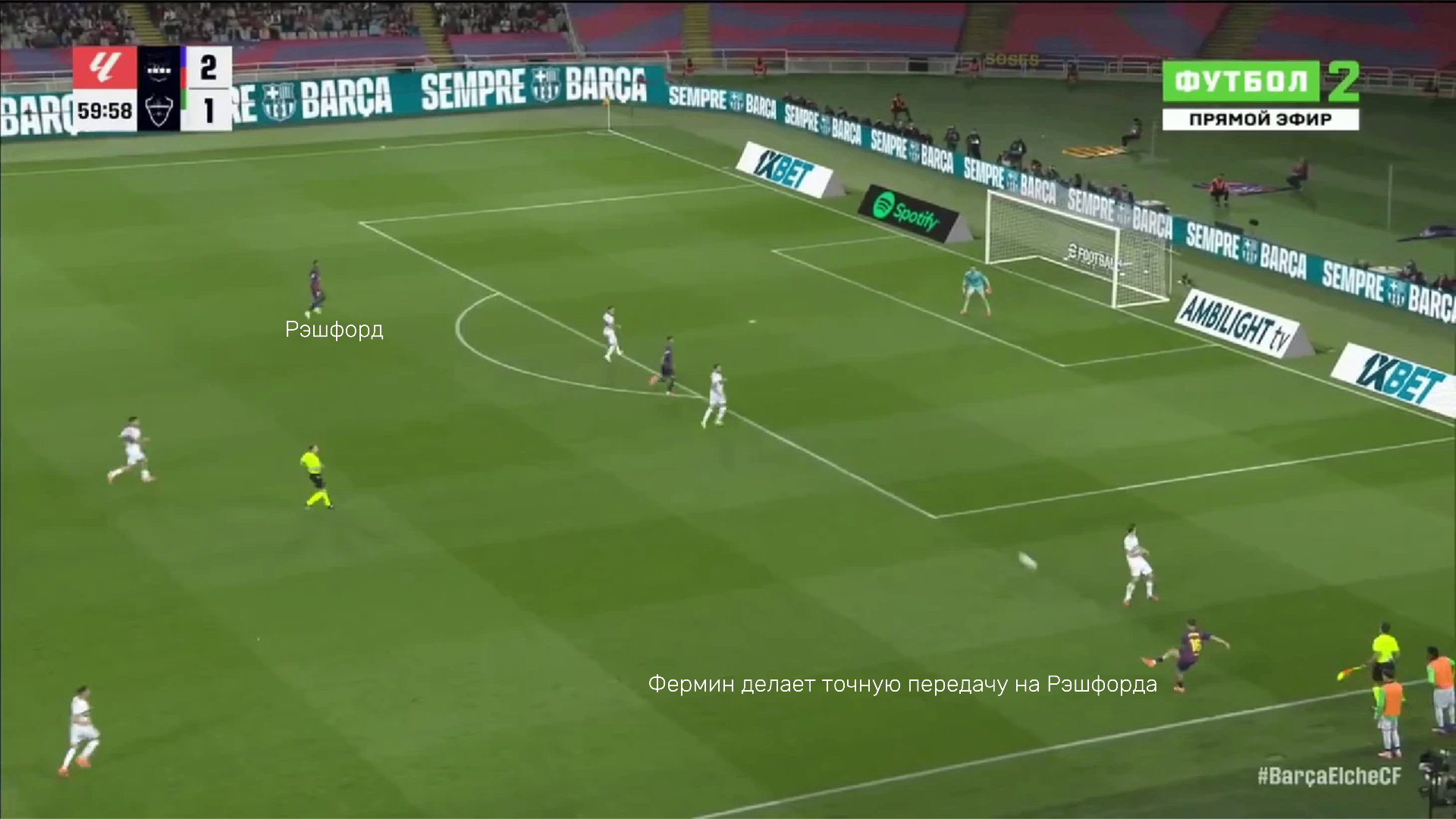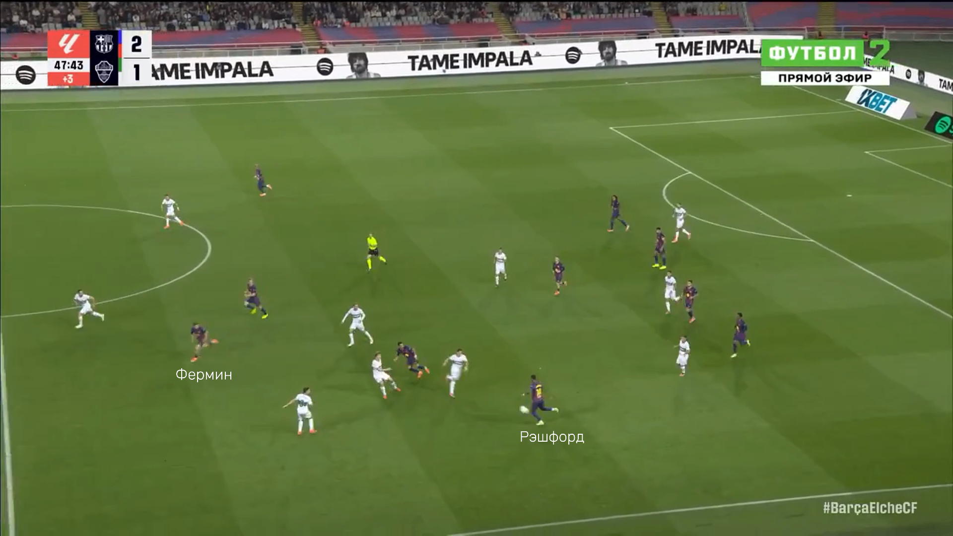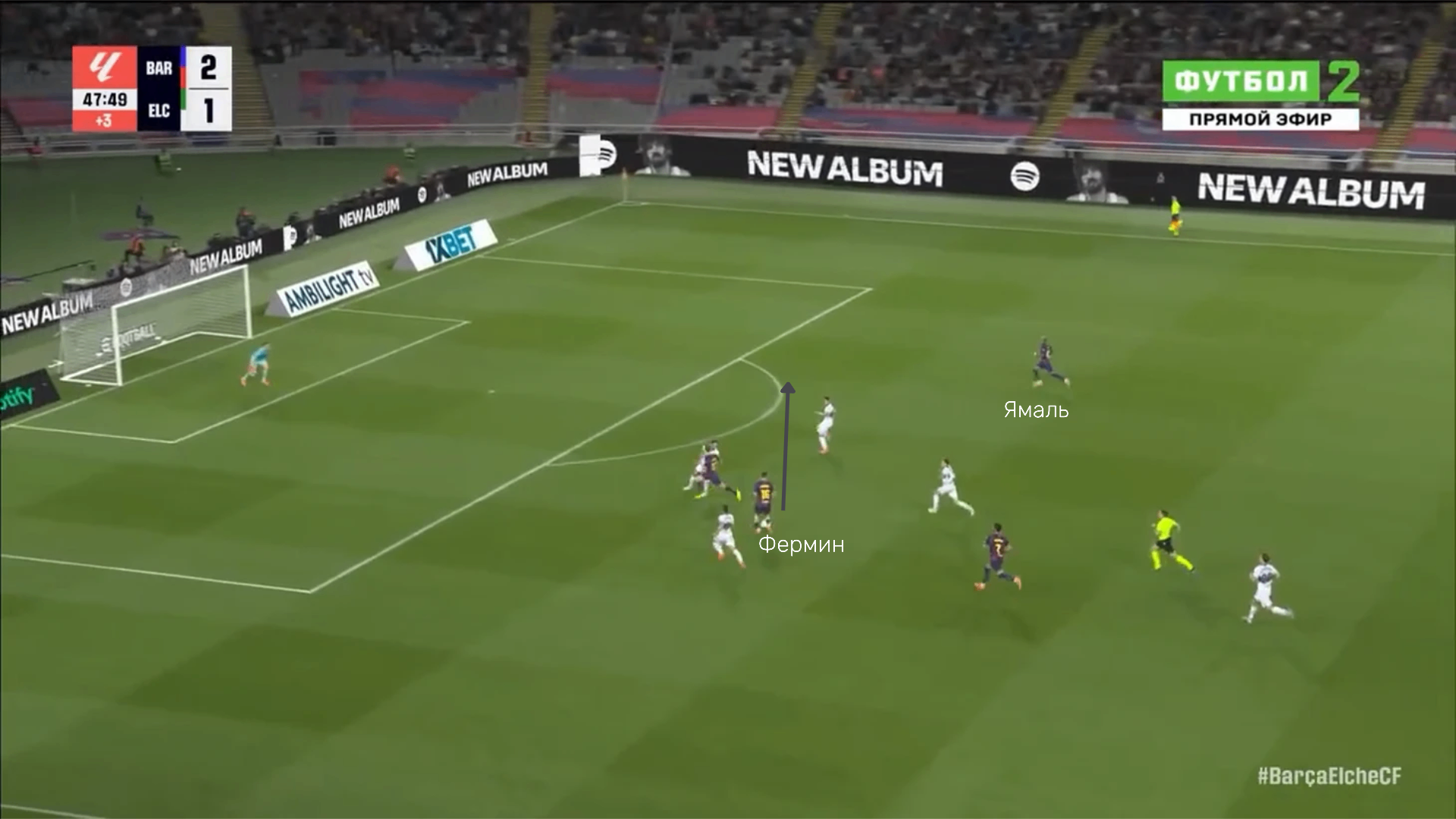 А здесь, Ямаль не сумел забить с передачи Фермина. Пере этим Лопес снова нашёл свободную зону за спинами оборонцев «Эльче».