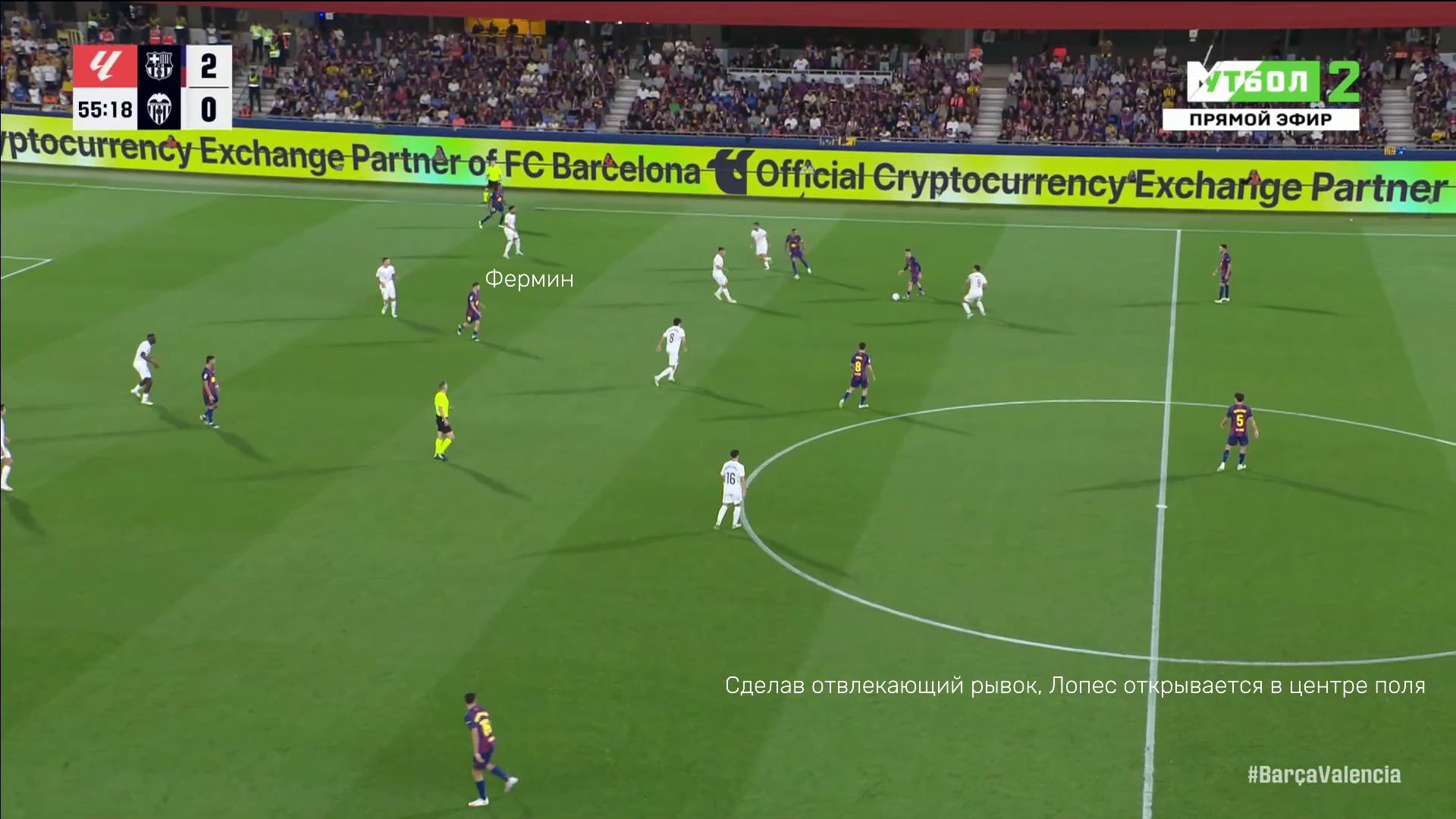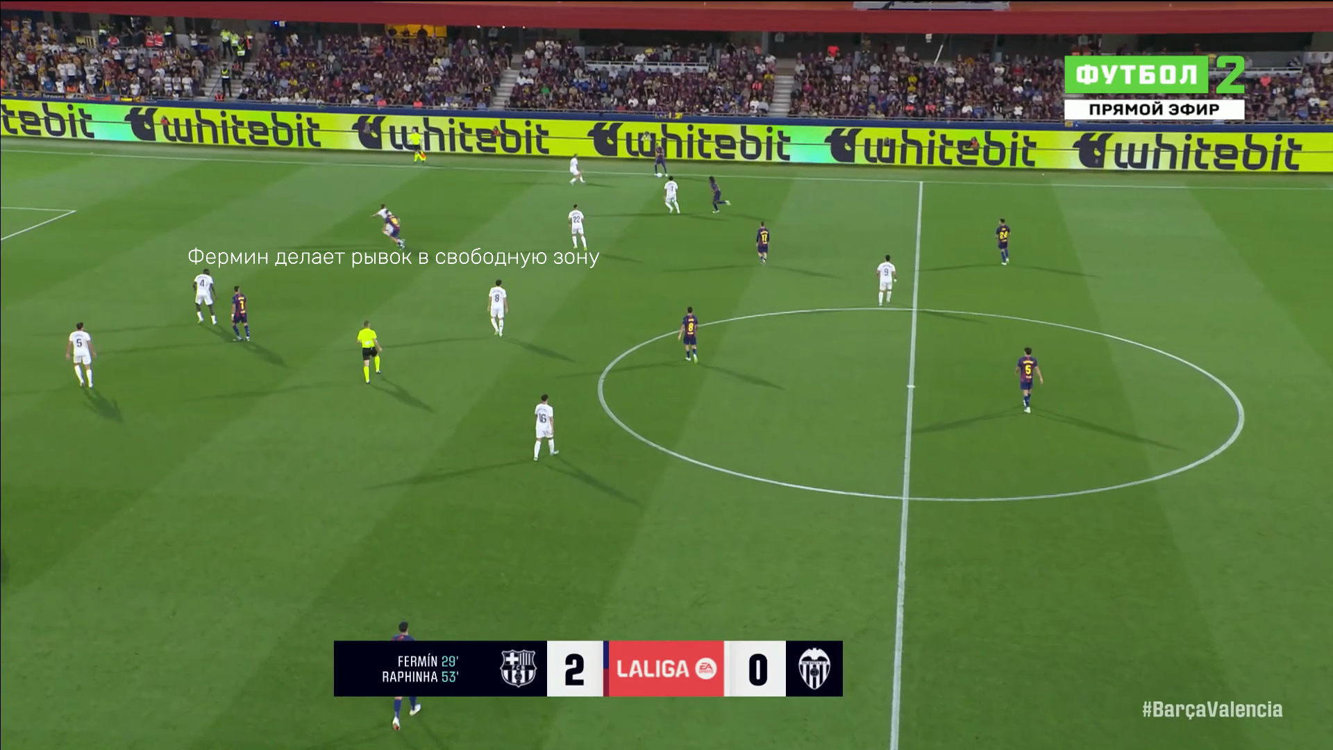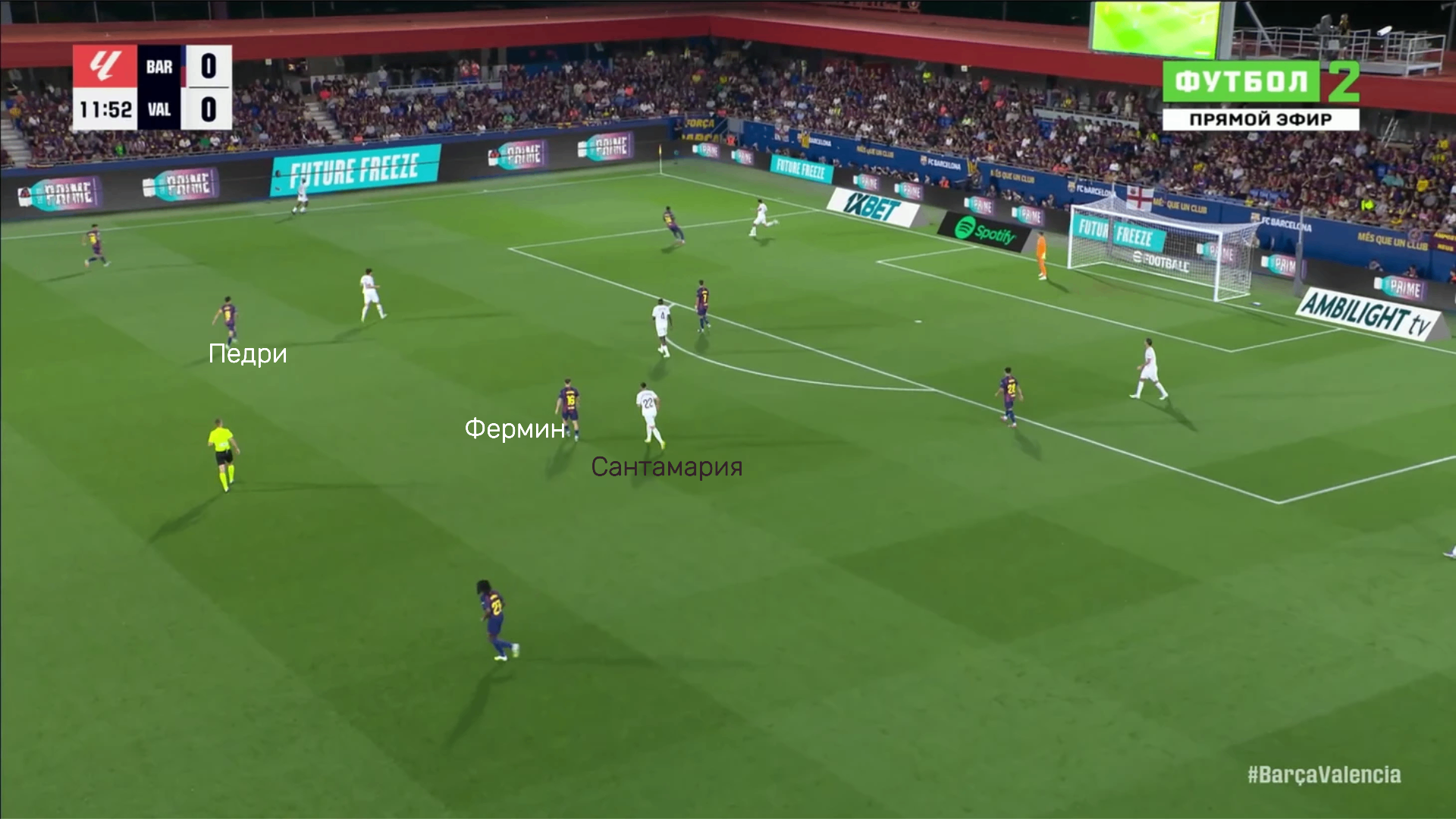 Фермин регулярно открывается в зоне между центральным и фланговым защитником соперника, как на скрине выше. Сейчас посмотрим на первый гол против «Валенсии», который случился благодаря своевременному открыванию Фермина и точной передачи Феррана Торреса.