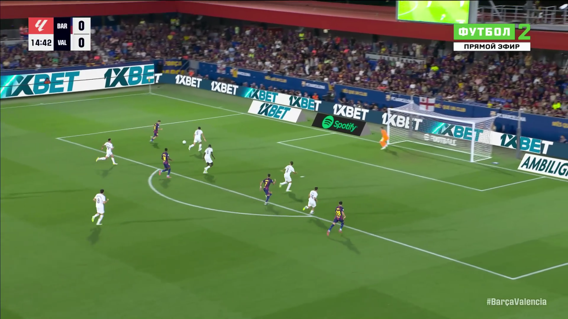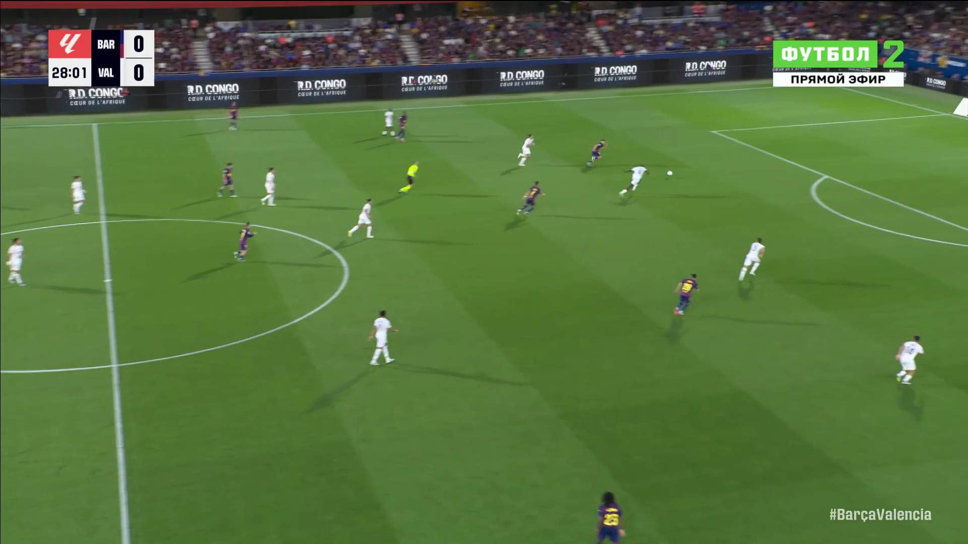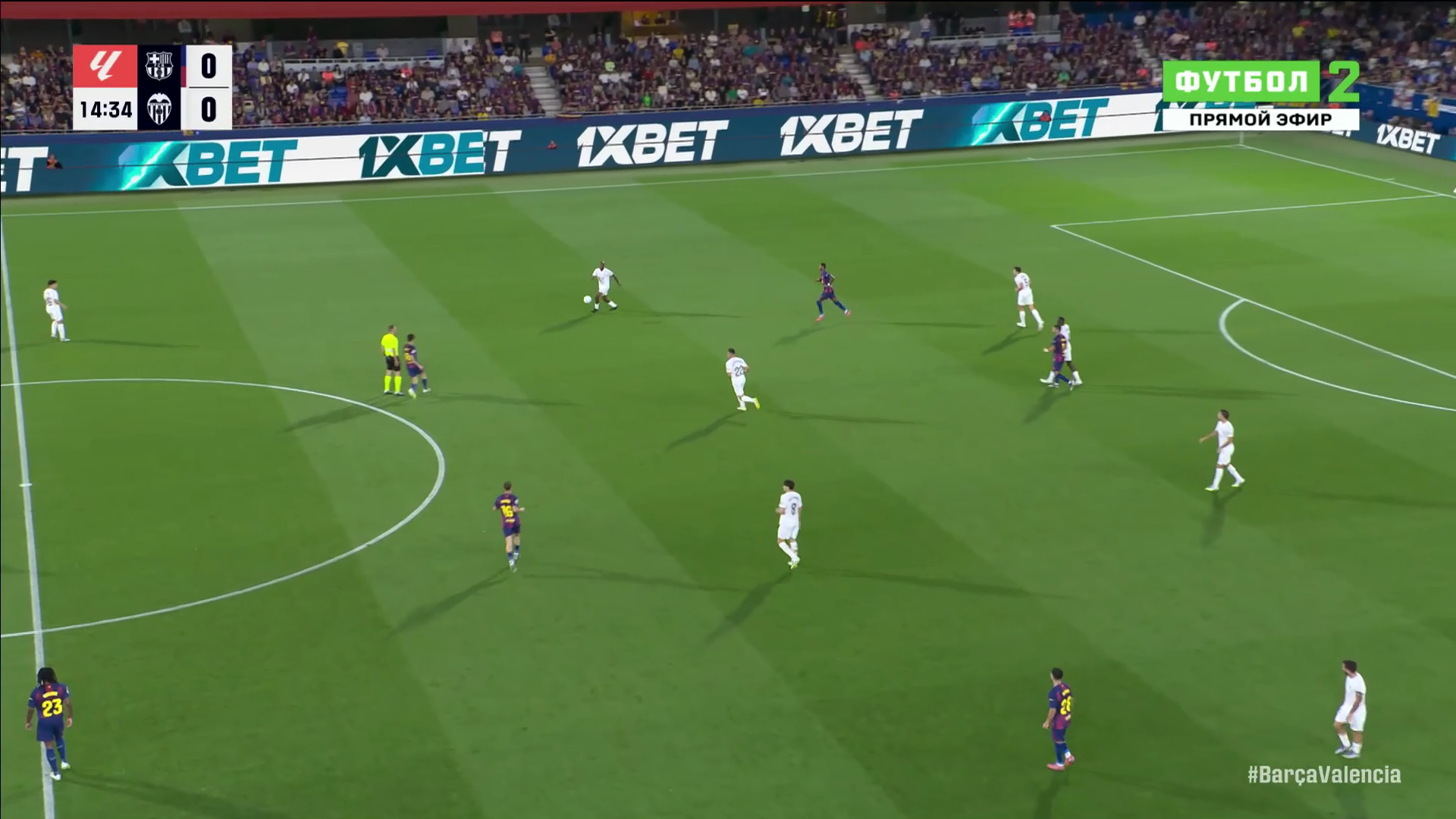 Фермин регулярно открывается в зоне между центральным и фланговым защитником соперника, как на скрине выше. Сейчас посмотрим на первый гол против «Валенсии», который случился благодаря своевременному открыванию Фермина и точной передачи Феррана Торреса.