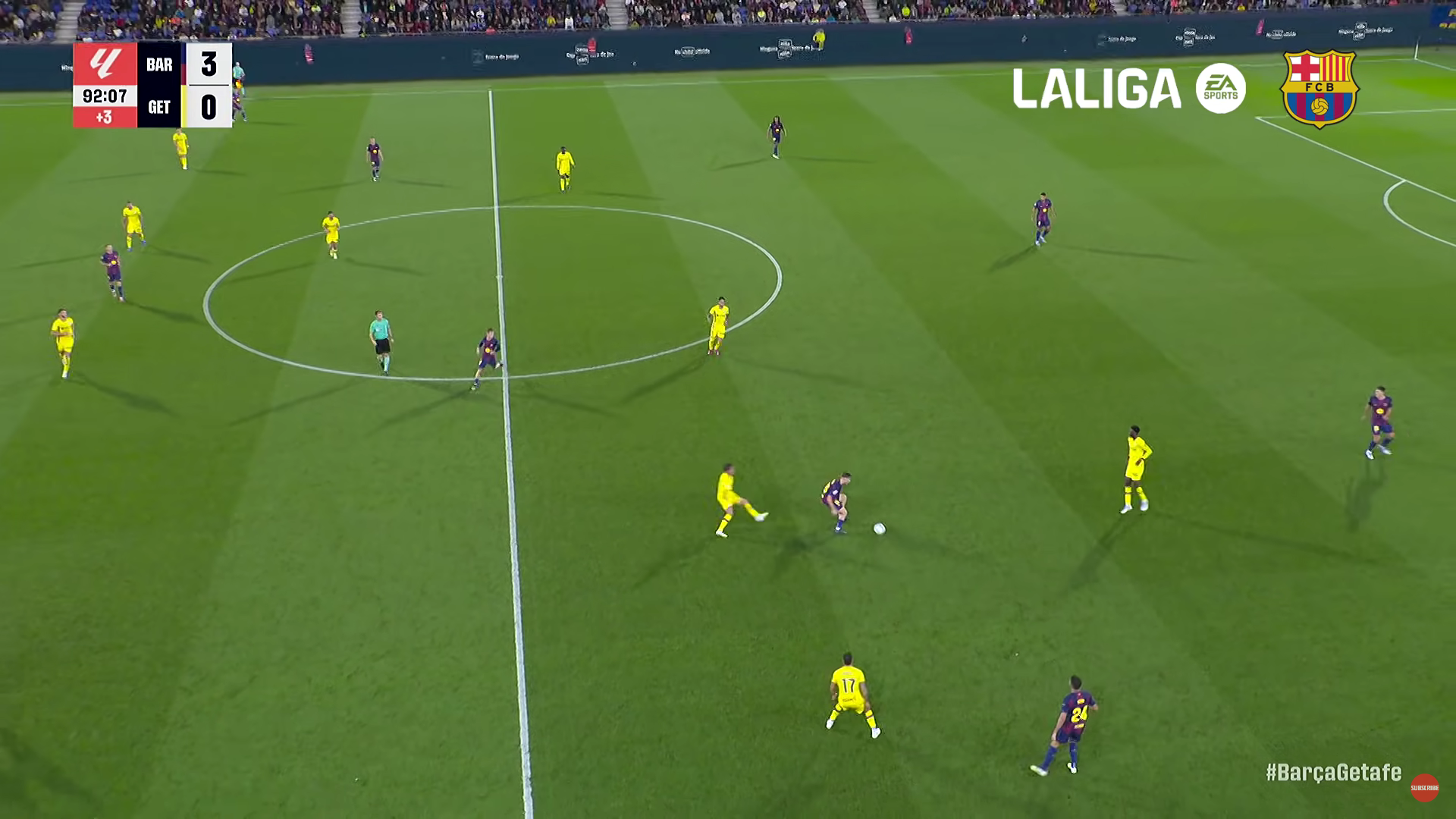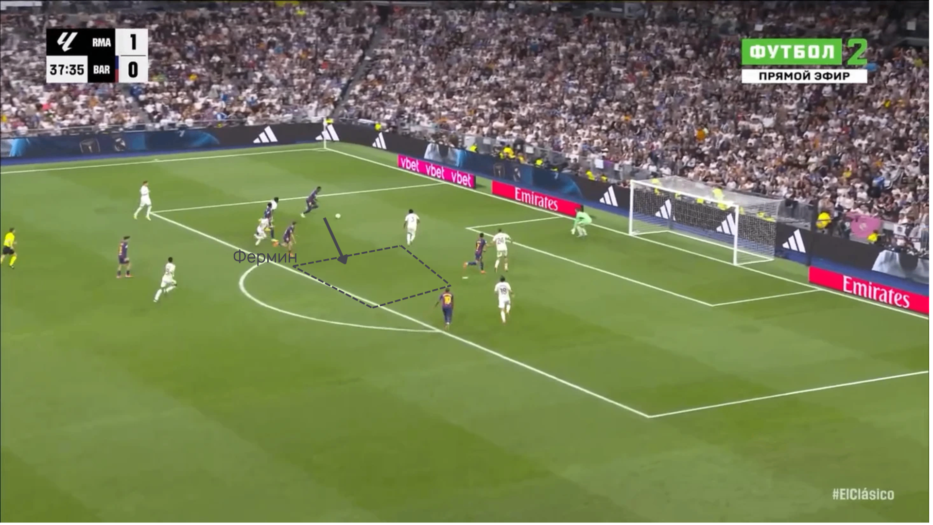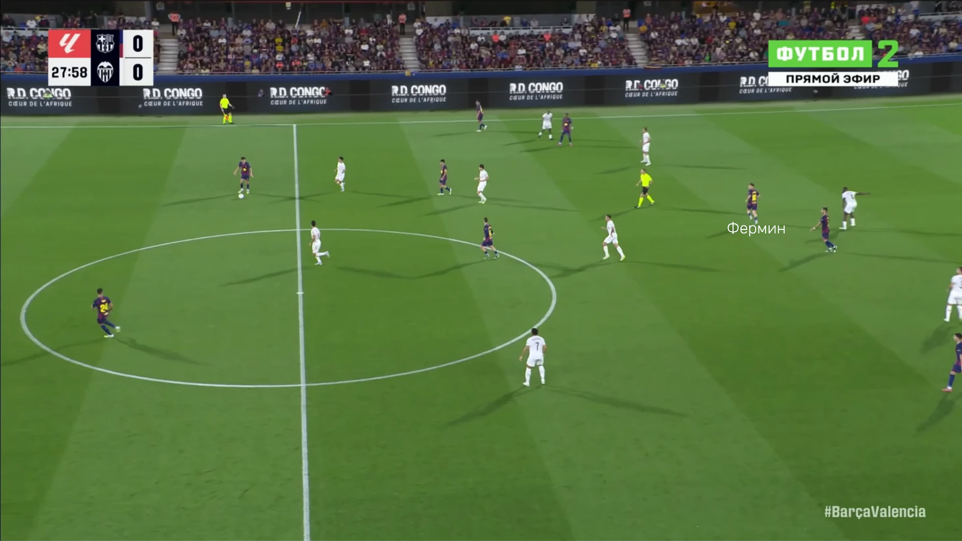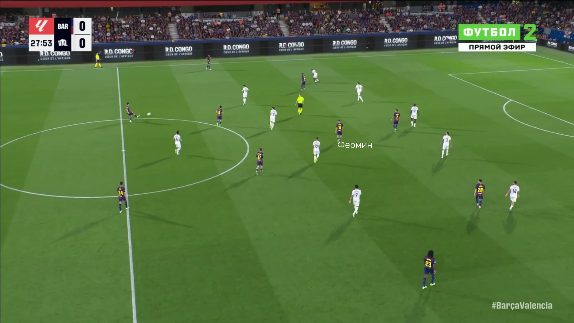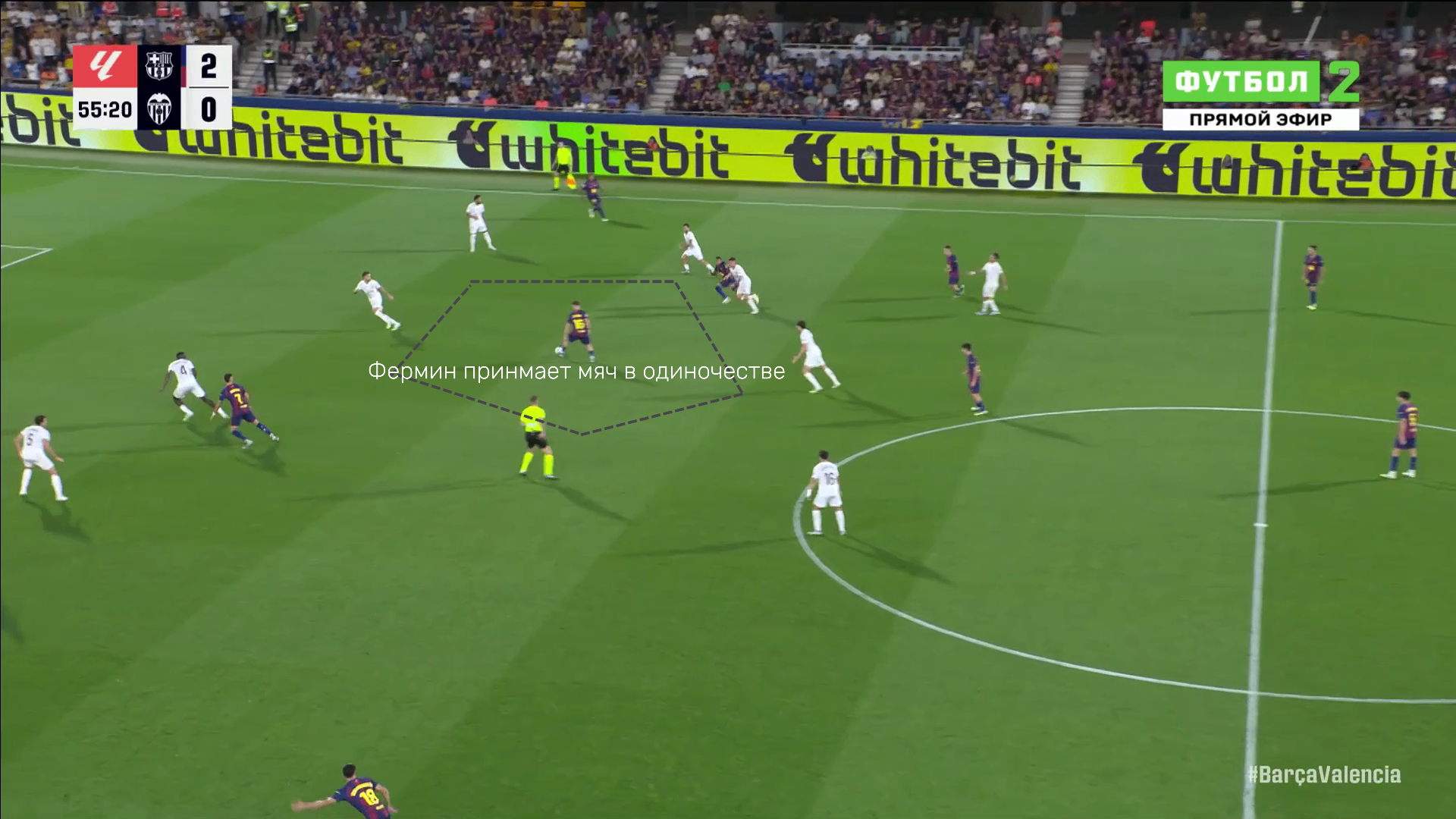 Справедливости ради, Фермину было тяжело. Эти игры он провёл не так ярко, зато у него была возможность показать весь свой потенциал в том, что касается поиска зон и мяча. Фермин всё же находил моменты, чтобы встретиться с мячом и обострить или открыть зону для партнёра. Например, менялсь позициями с Ямалем.