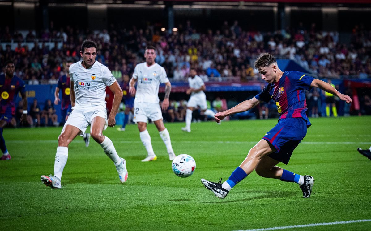 Фермин Лопес обороняется против полузащитника «Валенсии» Сантамарии и находиться на одной линии с Педри.