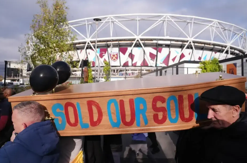 Гроб, украшенный лозунгами «Продали нашу душу» и «Хватит лжи», пронесли к лондонскому стадиону, а болельщики выражали гнев на владельцев клуба.