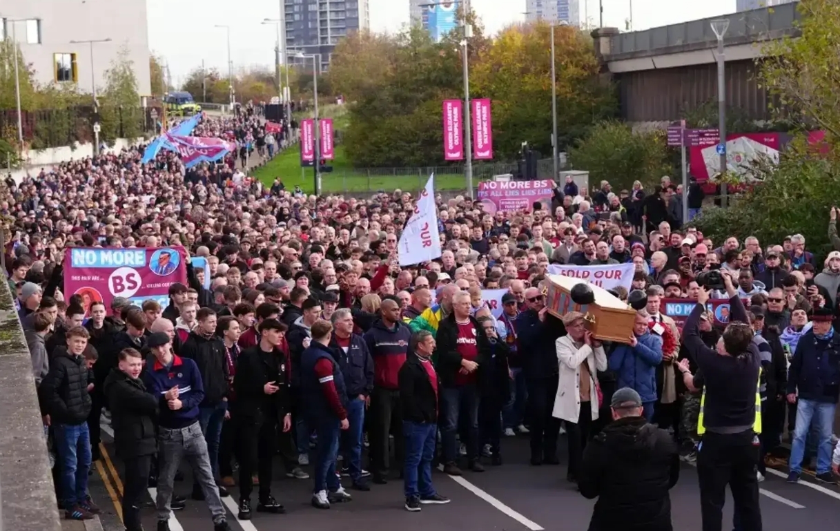 Тысячи болельщиков «Вест Хэма» устроили акцию протеста накануне матча АПЛ с «Бернли», неся гроб, символизировавший «смерть» идентичности клуба.
