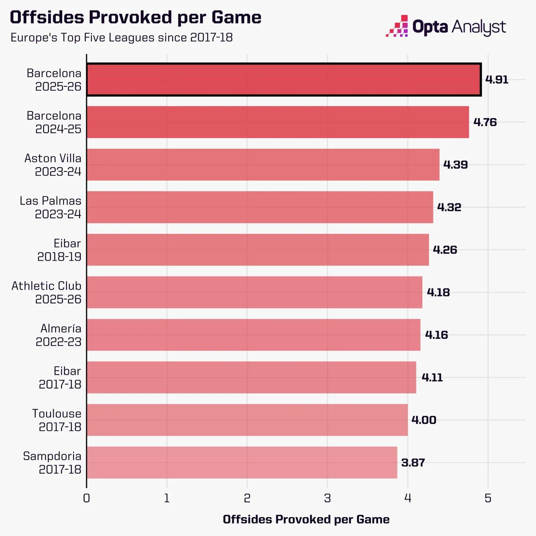 Статистический ресурс выкатил график лучших команд по провоцированию офсайдов. В топ попали команды из пяти сильнейших лиг Европы, а за точку отсчета взяли сезон-2017/18.