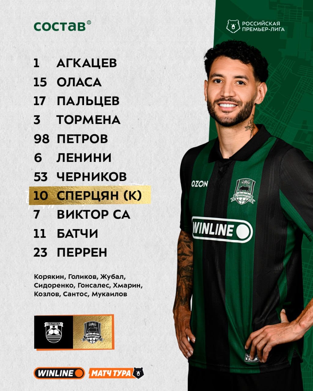 Главной интригой в составе «Краснодара» в отсутствие Кордобы был выбор нападающего. Тут вариантов масса: Са, Батчи, находящийся в топовой форме (правда в кубке) Козлов, габаритный столб-кордобозаменитель Мукаилов или лучше всех чувствующий пространство Перрен. Выбор пал на последнего: Гаэтан вышел в свободной роли, постоянно сваливаясь в глубину и на фланги. А вот позиции левого центрального защитника и опорников остались практически безальтернативнными, так что тут всё ожидаемо.