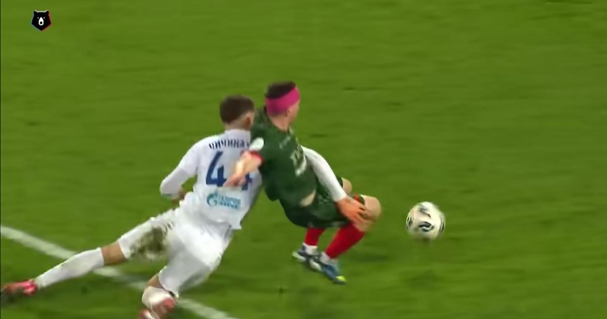 Черной стрелкой здесь показано направление мяча до контакта, с ногой Мартинса, красной - фактическая траектория после. Очевидно поэтому, что спартаковец сыграл в мяч и Левников не должен был фиксировать фол, которого не было. Проблема только в том, что эта ошибка судьи не является результативной - после свистка соперники перестали бороться и забитый гол не мог засчитать никто в нашем мире. Ну а третий момент из материалов ДСИ, пенальти в игре Ростов - Акрон, полностью противоречит и мировой практике (подробно - в том же обзоре)