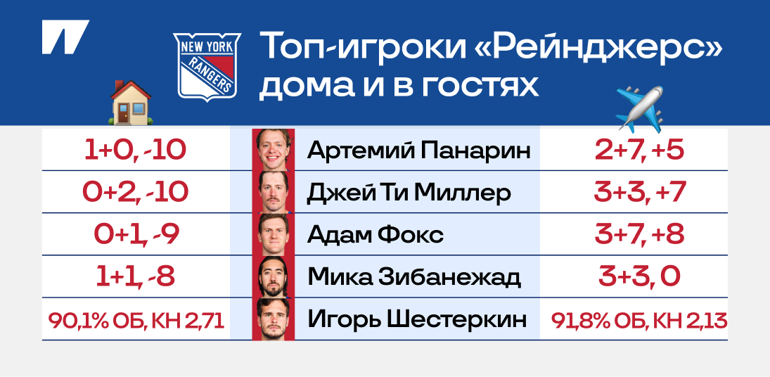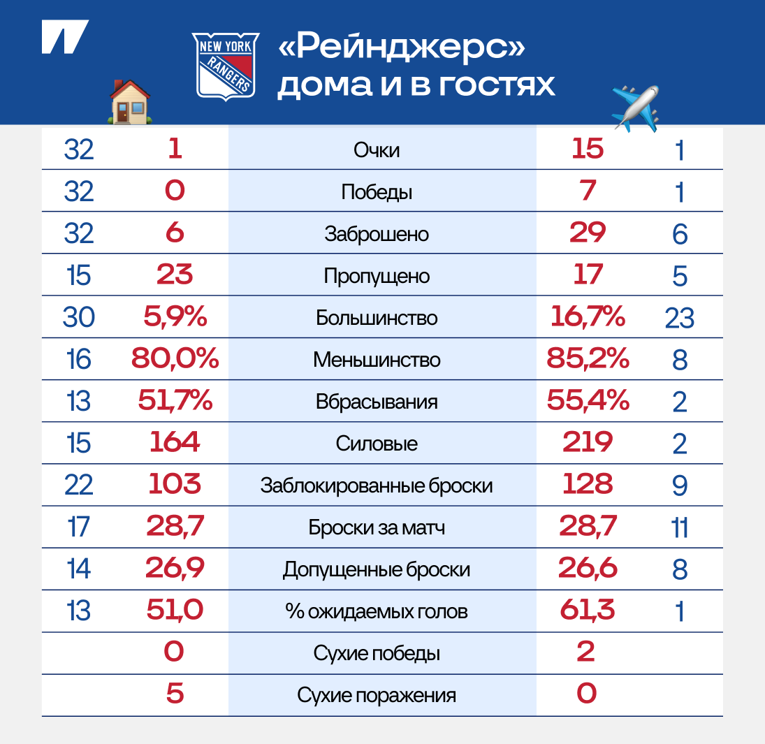 Самое забавное, что «Рейнджерс» – лучшие в НХЛ по игре в гостях! Что меняется, когда клуб покидает родные стены, непонятно, но дома и на выезде «Рейнджерс» – две разные команды.