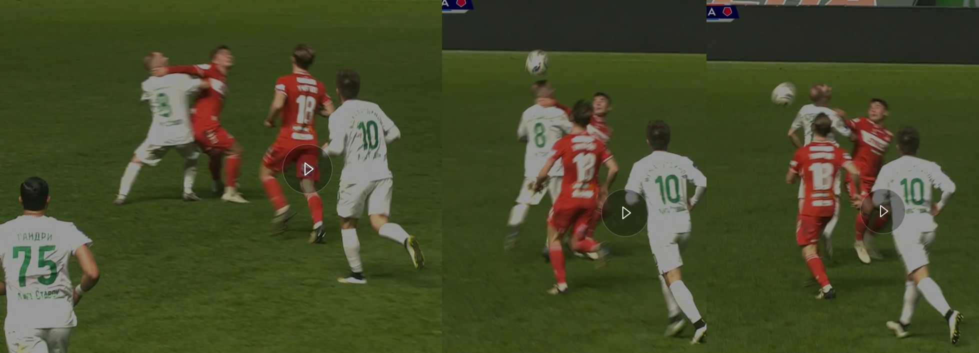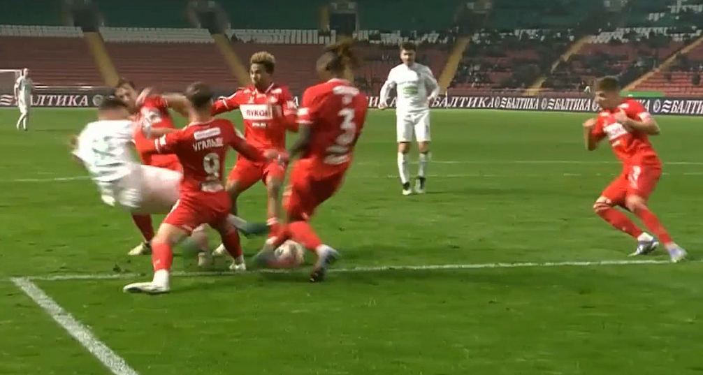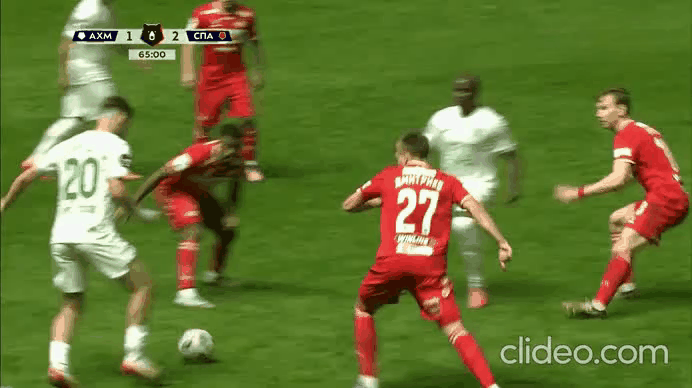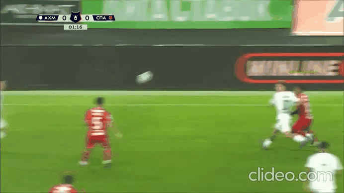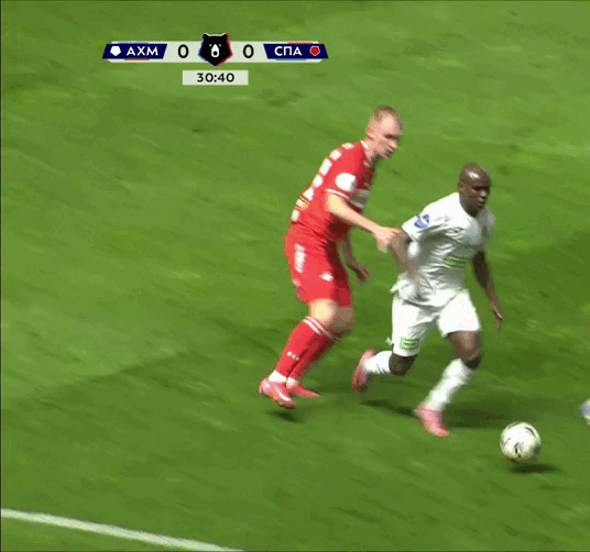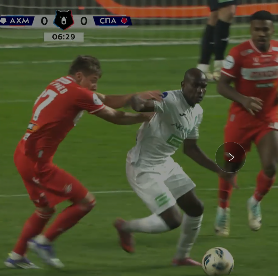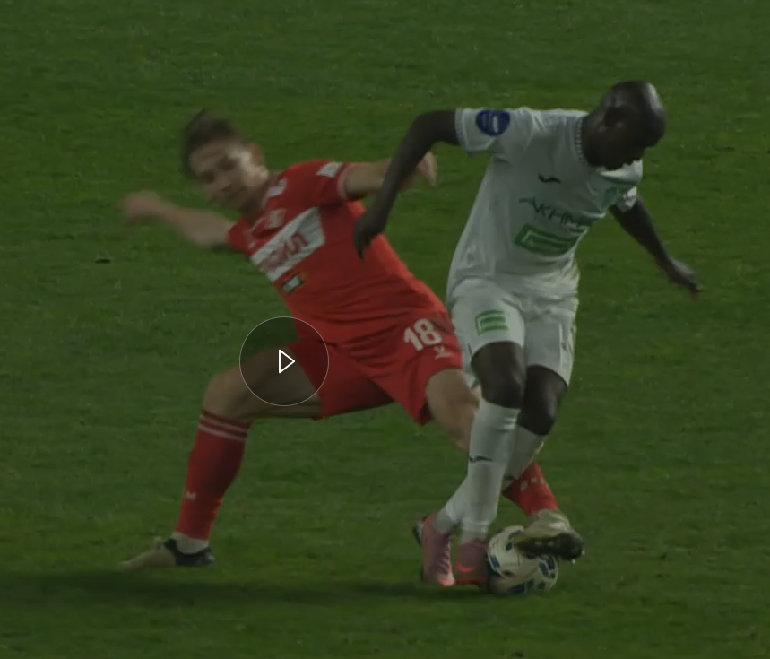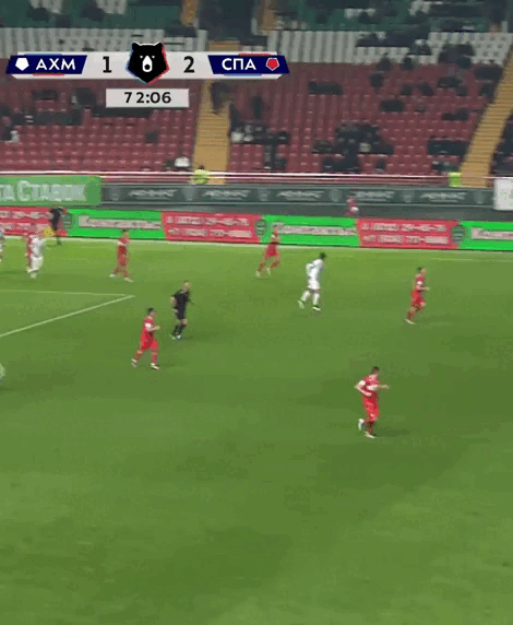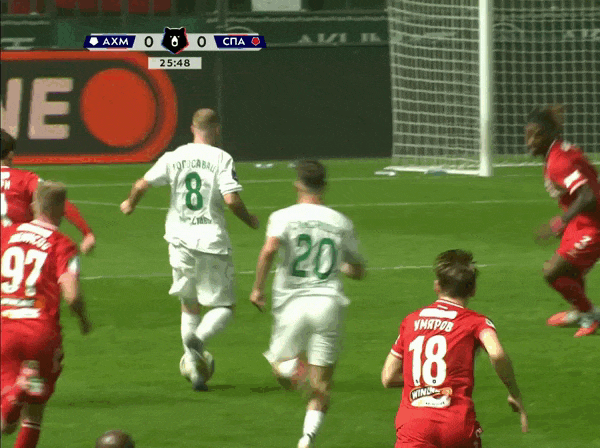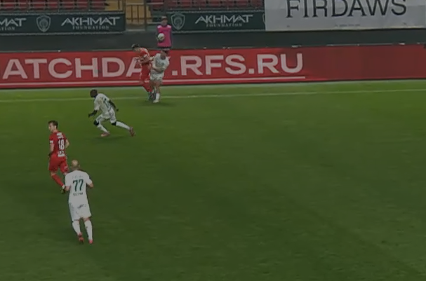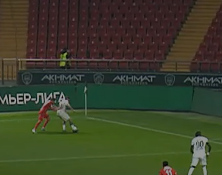На26 минуте Богосавац, прорываясь к воротам отдаёт неточную передачу и падает. Но Чистяков тут же возвращает мяч Ахмату , назначив за это падение опасный штрафной.