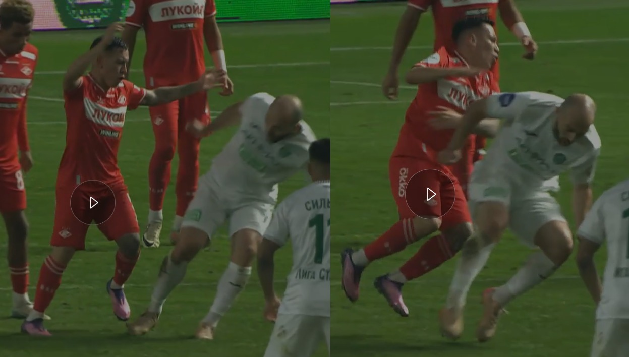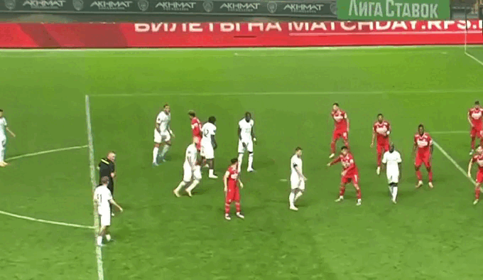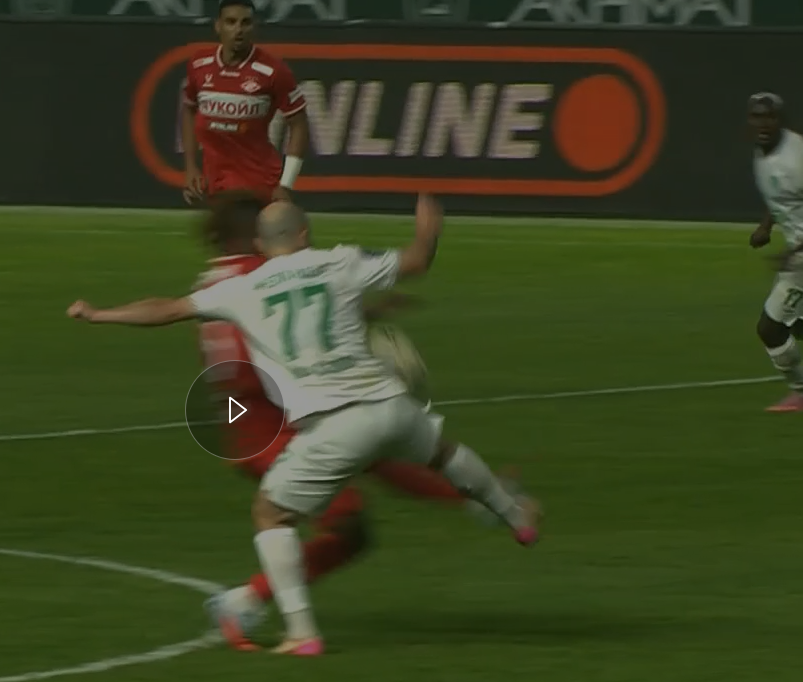 Что тут интересного? Ну во первых, что жёлтой карточки даже тут для Мелкадзе не случилось. А во вторых Чистяков не дал тут даже штрафного. Он просто вернул мяч Спартаку на его половину, после того как сделал внушение игрокам.