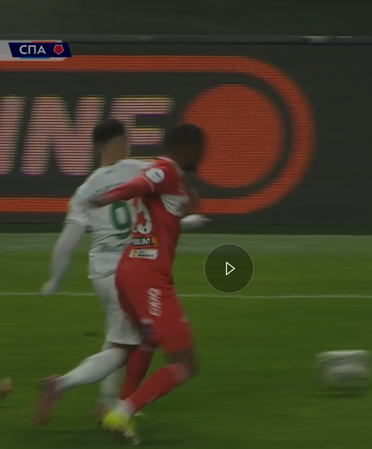 Ничего не напоминает? Матч первого тура с Махачкалой, если кто - забыл. Там была зеркально обратная ситуация, толкали Маркиньоса в штрафной, тот забить не смог, а зацепил мяч рукой и схлопотал жёлтую карточку. Тут Чистяков зафиксировал фол со стороны красно - белых и остановил их атаку в зародыше. Пока цепляться к этому не будем. Разные матчи, разные судьи. По своей сути - это фол. Просто - забавно, что на этом фоне комментаторы рассказывали про «высокую планку» борьбы, которую обычно держит Чистяков.