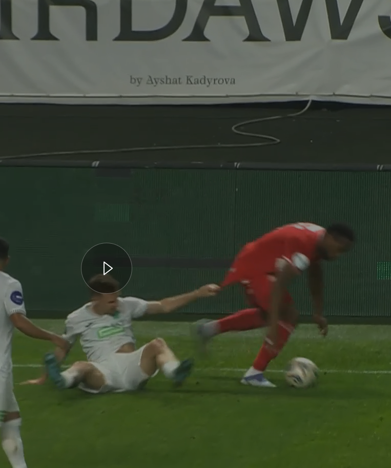 Возможно, сообразив, что оплошал, Чистяков тут же исправляется и придумывает фол в пользу Ахмата. Касинтура спотыкается о стоящего в центре поля Умярова, который даже не смотрит в его сторону, и судья даёт свисток о нарушении. Забавно, что в момент фола, Чистяков находится спиной к эпизоду. Кажется это для него уже славная традиция - свистеть фолы Спартака, не видя их. Флешбэки дерби.