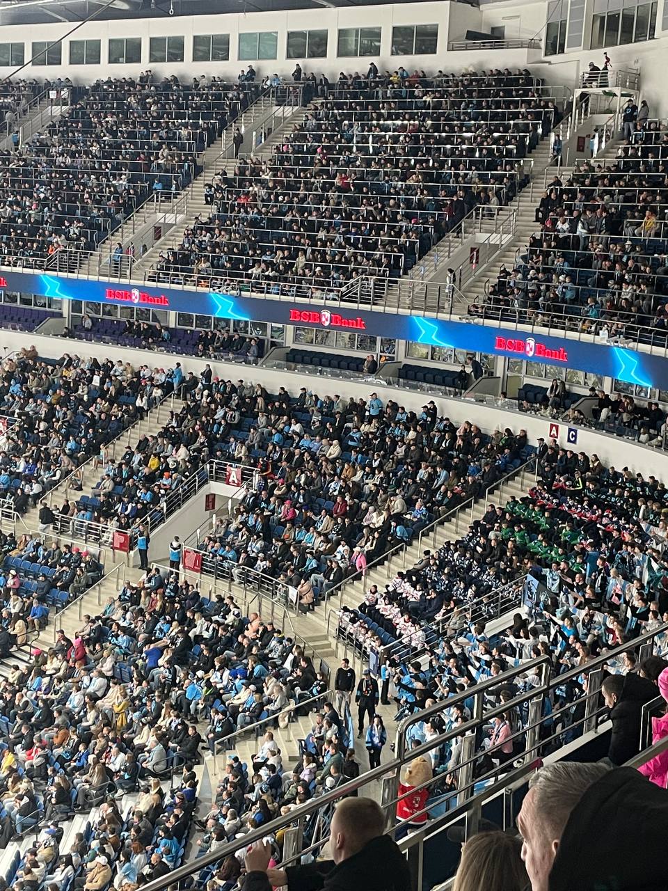Поднимаемся на самый верх арены. Правда это самые высокие места. И пытаемся занять свои сидения. И тут начинается самое для меня тяжелое. Если на футболе мы особо не парились и сидели за столиком, где я мог ногу вытянуть, то здесь это было довольно проблематично. Сидеть для меня это пока тяжеловато. Нога до конца не сгибается и поэтому в какой то момент матча мне было уже не приятно находиться в таком положение. Время от времени приходилось вставать. Ну ладно, дальше надо без нытья продолжить.