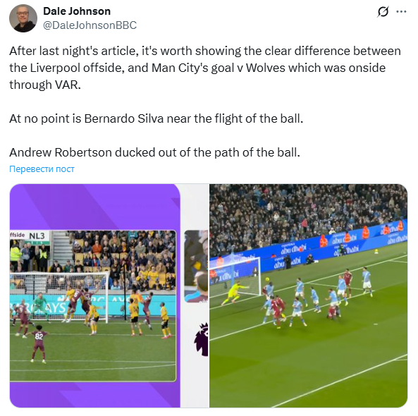 Это же мнение поддержал эксперт ESPN по VAR Дэйл Джонсон: «Бернарду Силва не был в зоне полета мяча. Эндрю Робертсон уклонился от него».