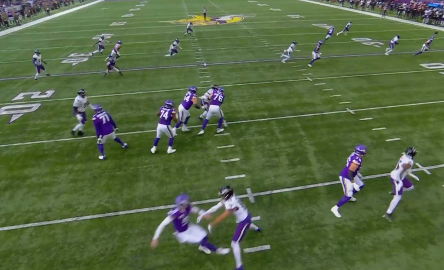Ламар в отличие от МакКарти, выбежав вперёд из развалившегося конверта, метать не стал, а пробежался ногами 8 ярдов. 1&10.