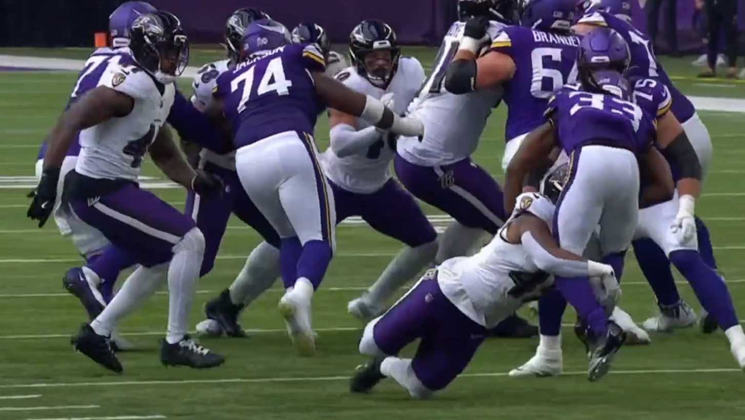 Ламар влево ногами. Чуть не добежал. Завалили. 1&гол на 2 ярдах. Надо поставить жирную точку отличного драйва.