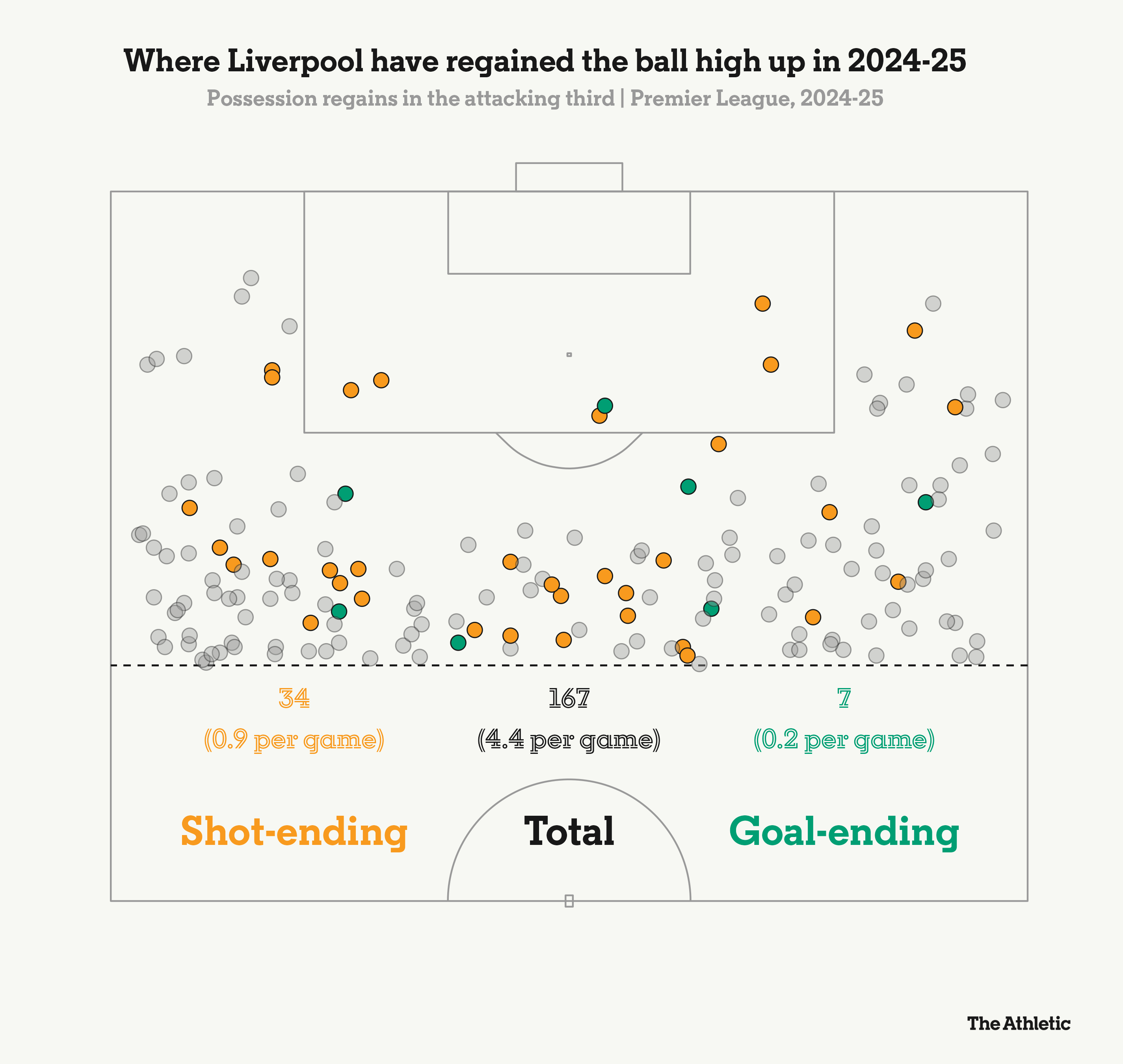 В сезоне 2024/25 они в среднем отыгрывали владение мячом 4,4 раза в атакующей трети.
