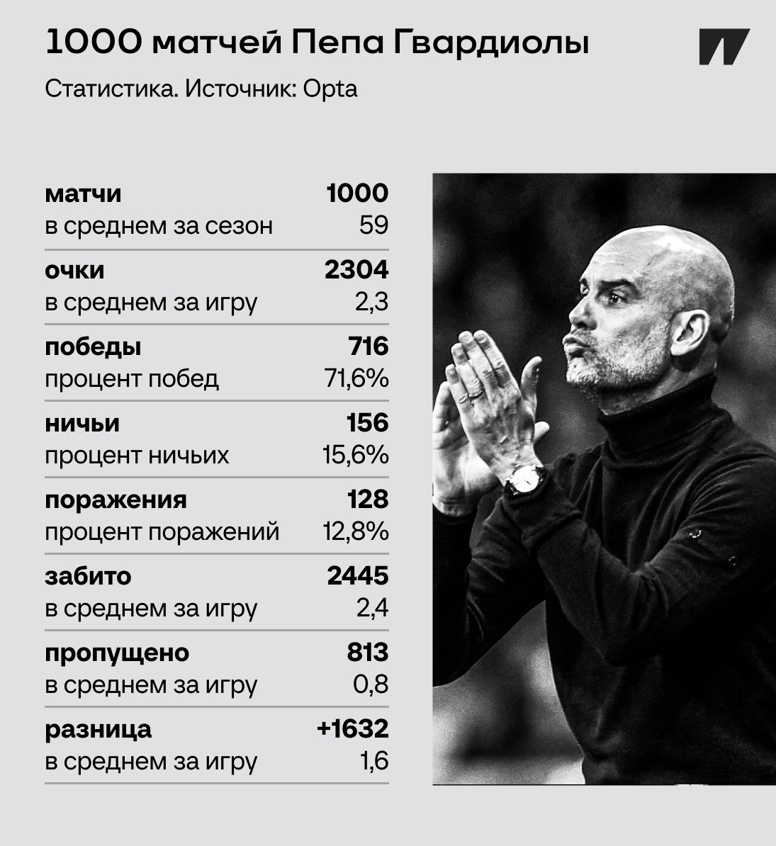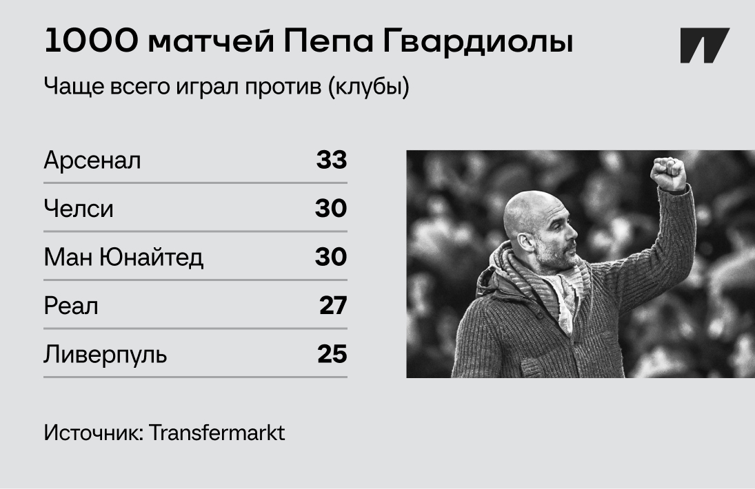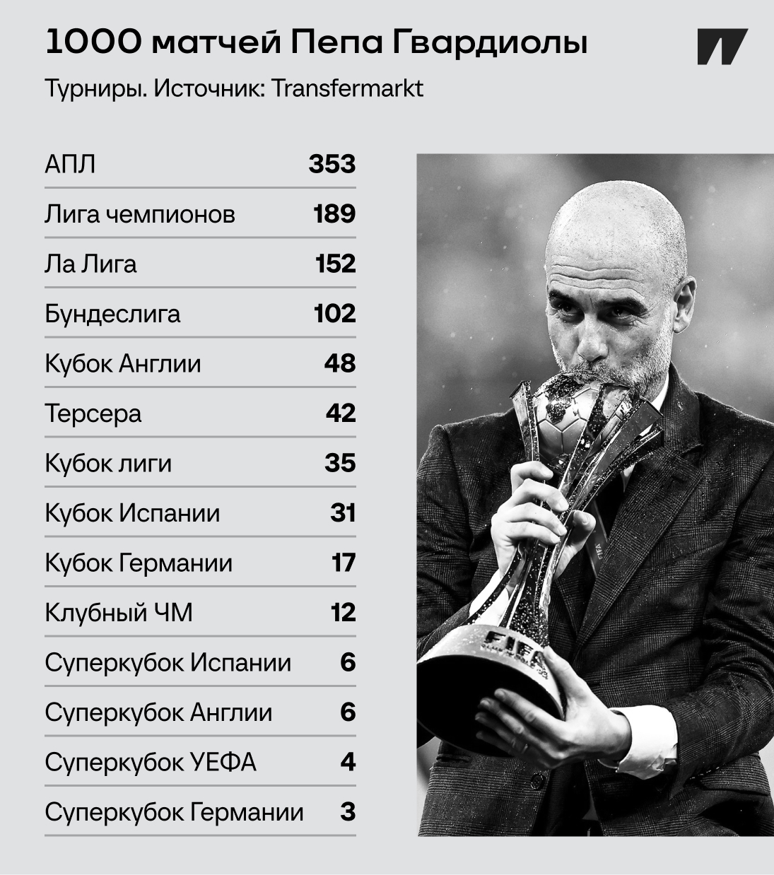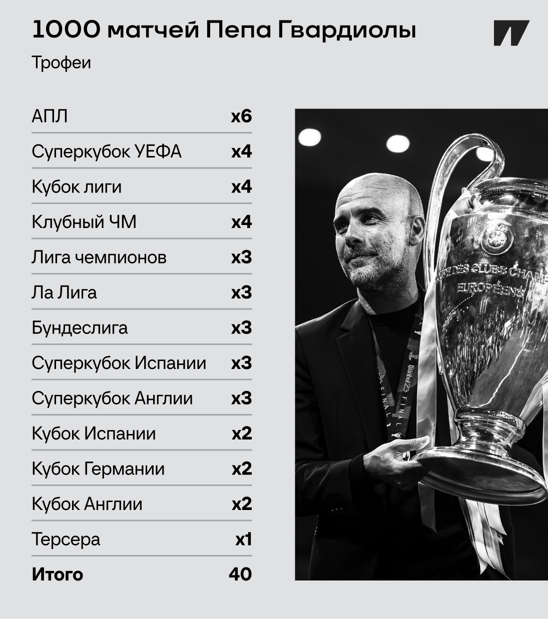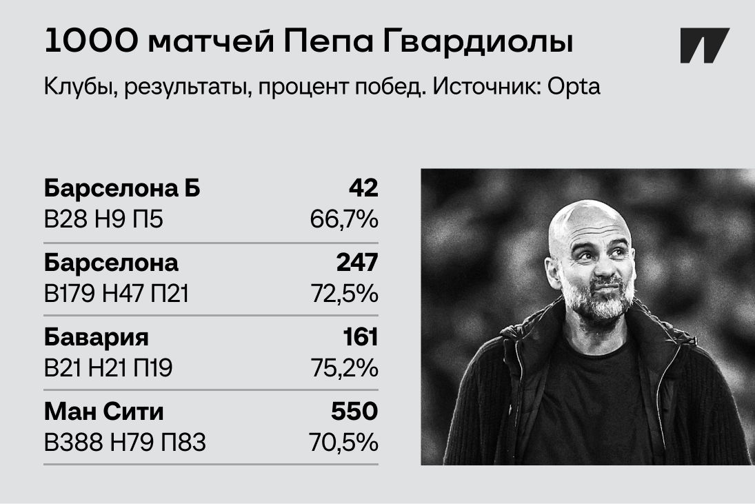 Воскресенье вышло для Пепа Гвардиолы приятным вдвойне: не только убедительно обыграл «Ливерпуль» (3:0), но и провел тысячный матч в статусе тренера. Мы посчитали, из чего состояла эта тысяча, какие игроки и соперники были важнейшей ее частью.