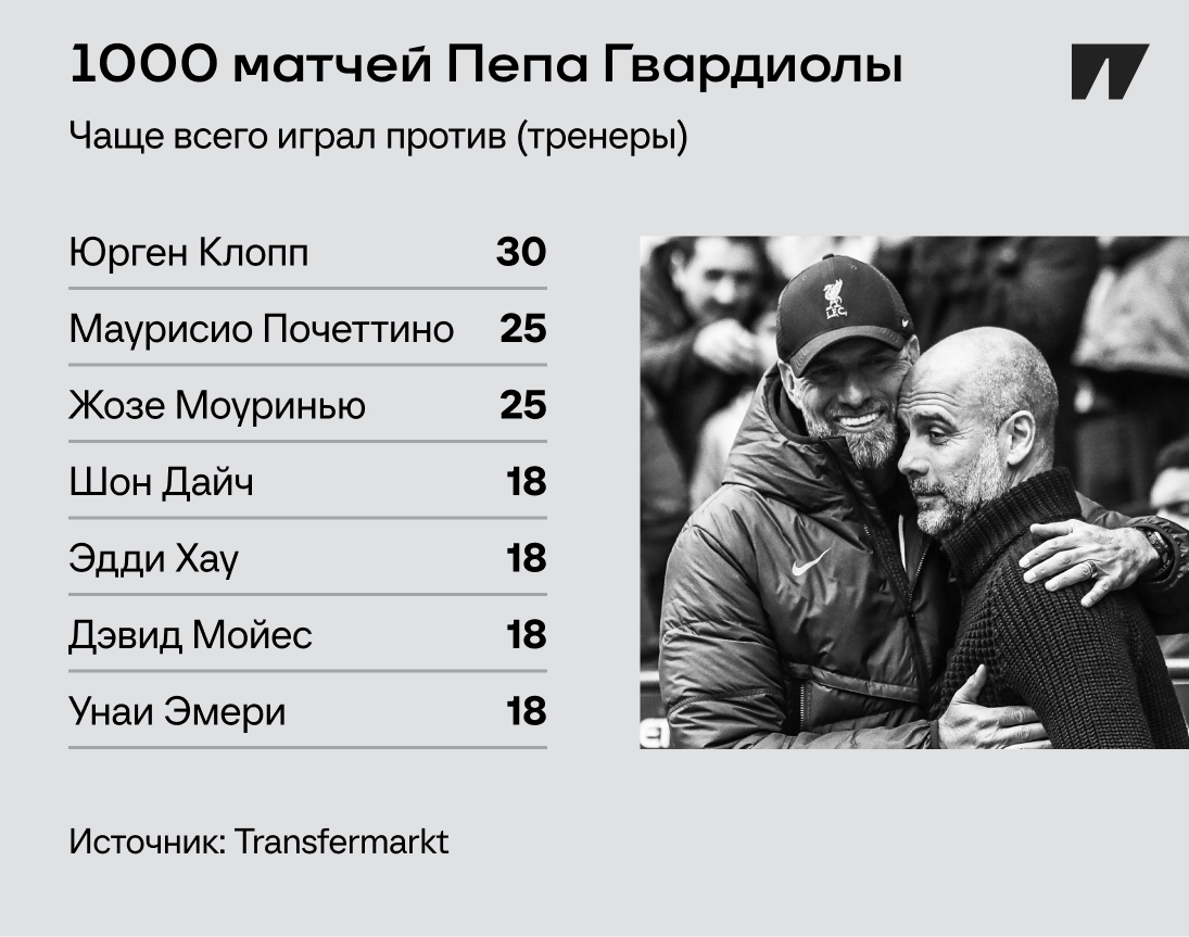 В топ-7 тренеры, с которыми Пеп пересекался не только в АПЛ, и троица британских работяг − Эдди Хау, Дэвид Мойес и Шон Дайч. Чаще всего Гвардиола проигрывал Клоппу (11), почти всегда обыгрывал Дайча (16 побед и 2 ничьих).