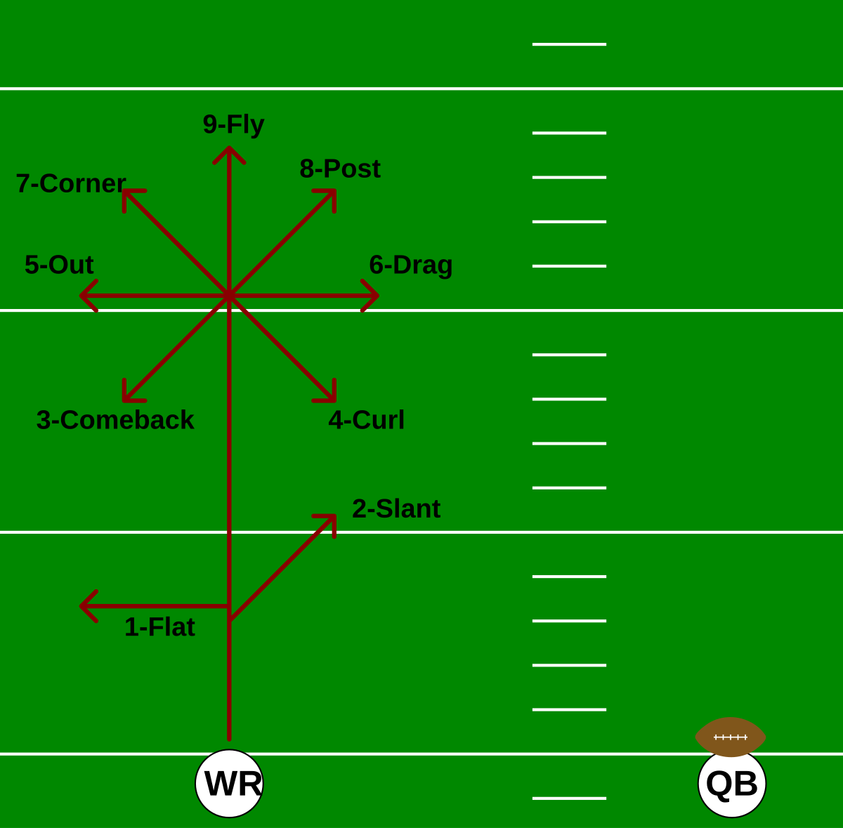 Что такое горизонтальные маршруты? Грубо говоря, это маршруты, которые бегутся поперек поля. Если вам что-то говорит, то это маршруты типа слэнт, ин, аут, тот же кёрл и тд. Все они сделаны для того, чтобы принимающий мог как можно быстрее открыться, а квотербек избавиться от мяча.