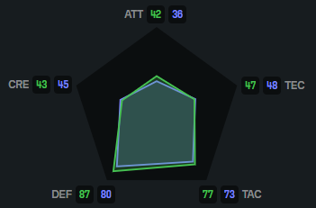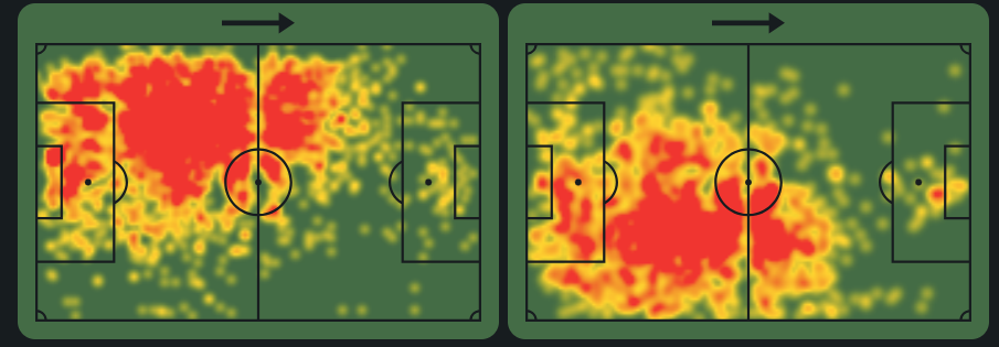 -Нико также демонстрирует вторичный разброс по левому флангу, что указывает на его способность растягивать оборону соперника. Такое широкое расположение усиливает тактическую вариативность и открывает больше возможностей для передач или перекрытия позиций.