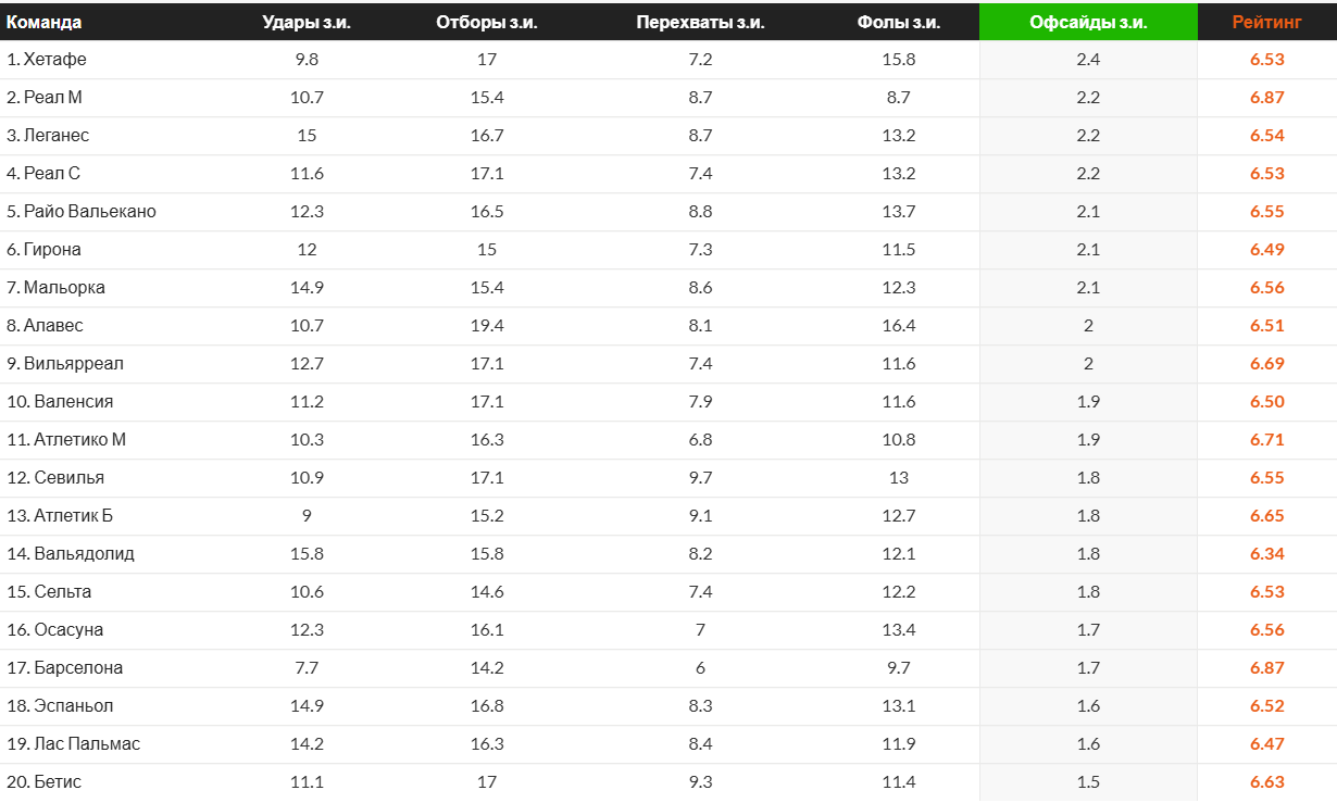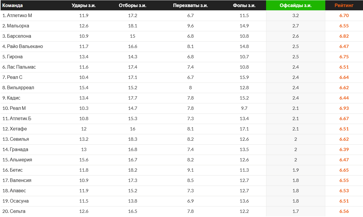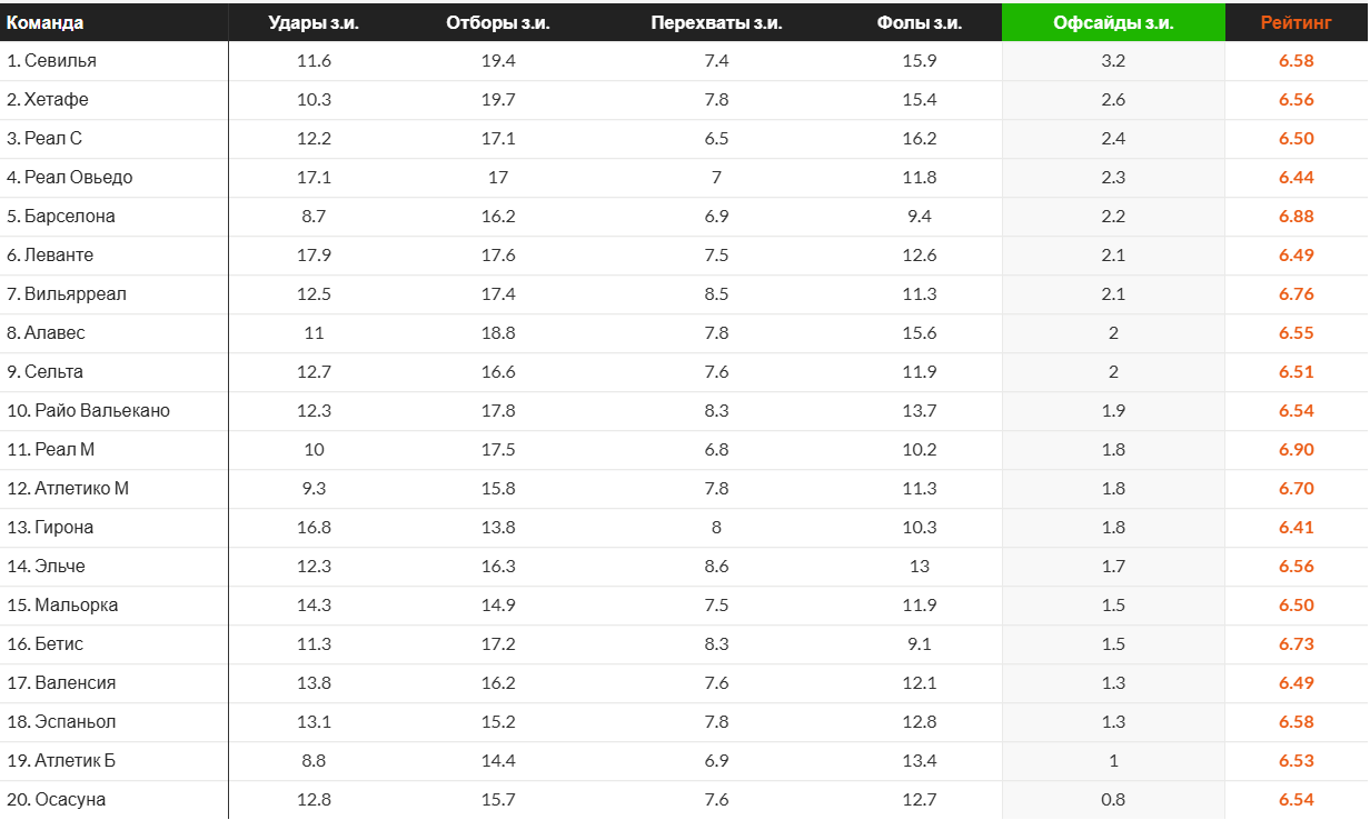Сейчас ноябрь, а значит скоро силы у команд станут заканчиваться и верхние показатели начнут снижаться. Вызывают удивление офсайдные цифры прошлогодней «Барселоны», подвергая сомнению тезис об их соответствии с высотой линий. Но если в нем не усомниться, то все остальные показатели в таблице выглядят достаточно логично. Например, «Бетис». По их последнему месту можно сделать вывод, что они обходили стороной высокий прессинг, сбавляя интенсивность матча, что привело команду без большого ресурса в финал Лиги Конференций.