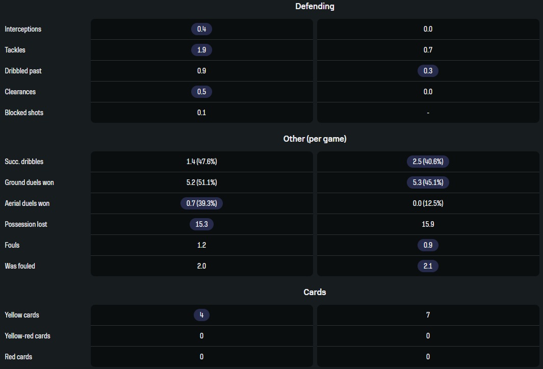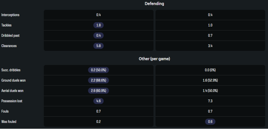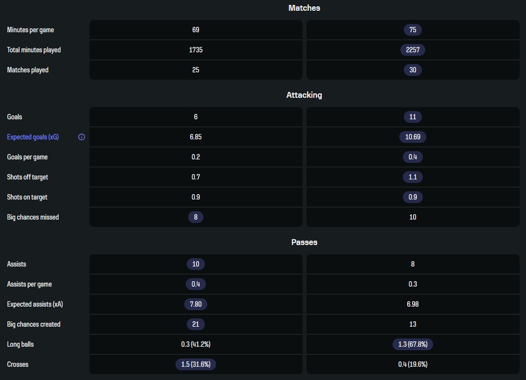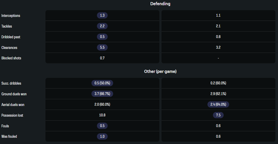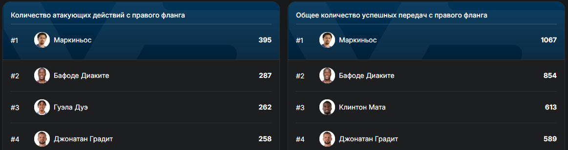 Явное преимущество нигерийского англичанина. Но ведь это был неудачный сезон Винисиуса, более эгоистичного игрока, поэтому атакующие показатели не столь далеко.