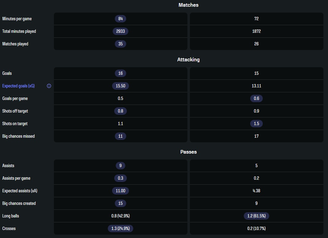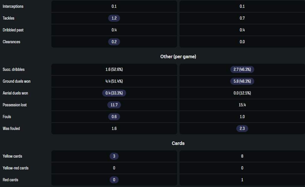 Статистика примерно равная (ресурс ошибочно выделяет в «ударах в створ» победу Винисиуса, вместо ничьей, а в «ударах мимо» Винисиус выходит победителем в антиноминации), с различными превалирующими (оно и логично, эти футболисты антитетичны). Сравнивается Букайо с Винисиусом исключительно как с абсолютной величиной медиа в футболе (но предлагаемая статистика обсчитывает лишь чемпионаты). Местами отличные показатели, помноженные на хайлайты и трофеи - и вот сравнение Сака и Винисиуса для многих становится смешным.