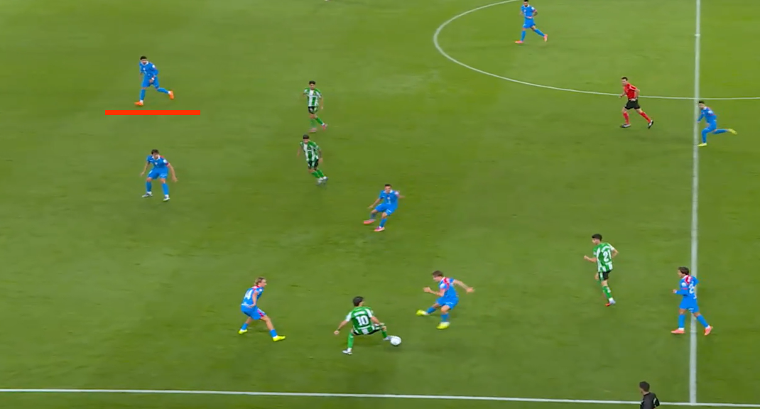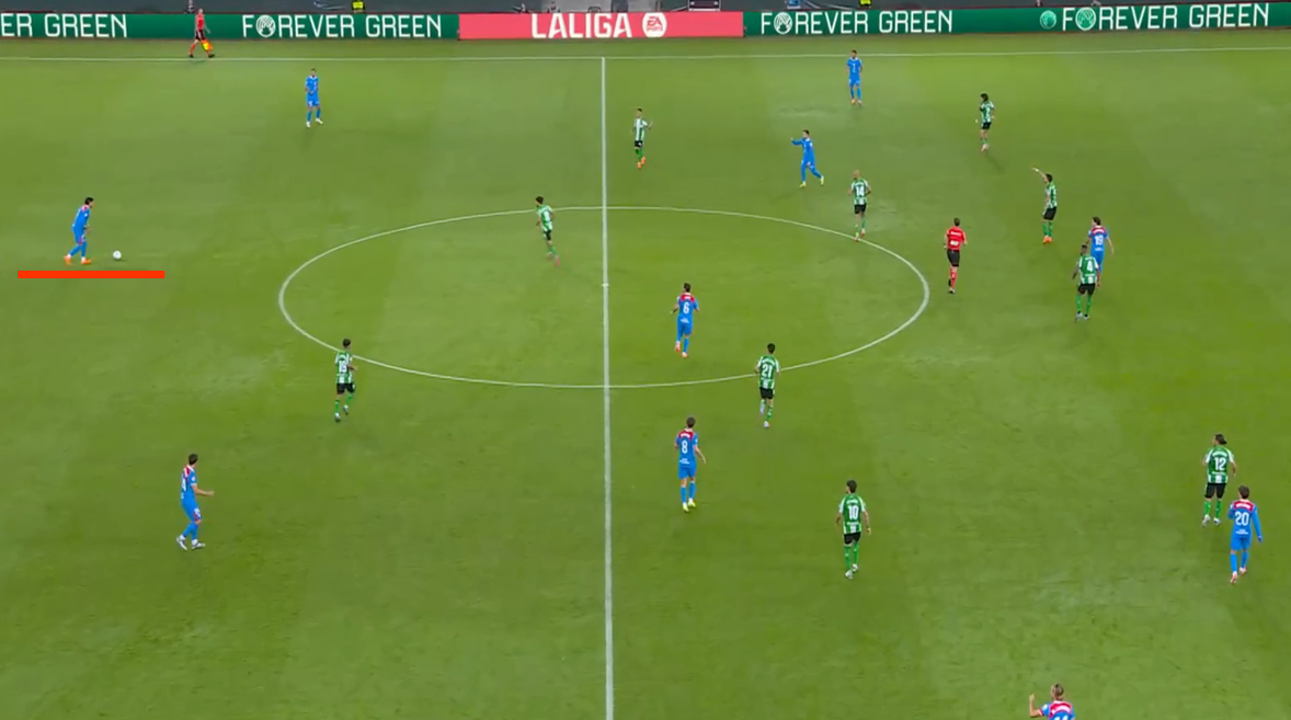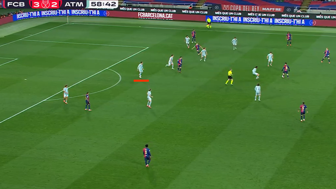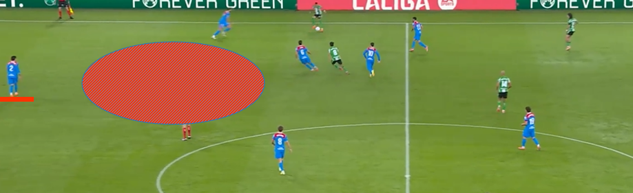 Два скриншота из матча с «Бетисом», сделанные за время одной атаки. «Атлетико» вышел в 4 защитника без мяча и на первом скрине видно как они располагаются (Руджери не влез). Классическая ситуация, левый центральный страхует правого, правый центральный правого флангового. Но Хименес правша и выпустили его не просто так слева. На втором скриншоте аналогичная ситуация с противоположного фланга, но Хименес и не думает смещаться, у него другая роль. Таким образом оборона «Атлетико», строится, обтекая уругвайца, призванного блюсти порядок. А вот как эта позиция выглядит в абсолюте. Только Лльоренте ломает линию.
