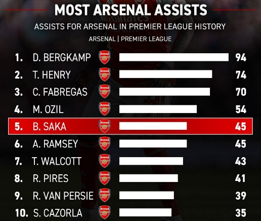 В позапрошлом сезоне Сака набрал 9,53 ожидаемых ассиста в Премьер Лиге и занял первое место по этому показателю, опередив Бруну Фернандеша и Мохамеда Салаха с их 8,82 и 8,65 хА соответственно.