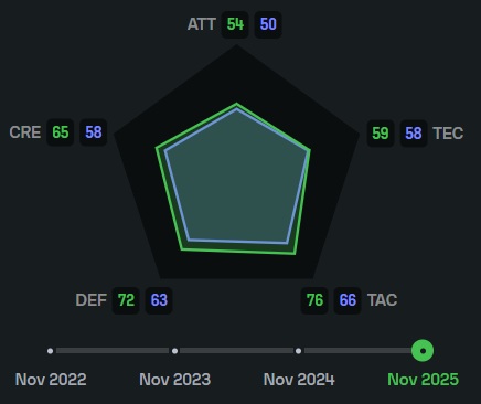 Sofascore ставит Хосе оценку 6.83 за сезон 2023/24. В сезоне 2024/25 количество офсайдов сокращается в полтора раза, Хименес проводит 28 матчей и зарабатывает себе 6.99 по итогам ЛаЛиги. В том же сезоне было двухматчевое противостояние с «Барселоной» в кубке (4:4 и 0:1). Важен первый матч, в котором «Атлетико» забил почти все, что имел, чудом не пустив больше, не без заслуги Хименеса. Там был Симеоне старого образца. Пожалуй, эта статистика немного да демонстрирует адаптивность уругвайца.