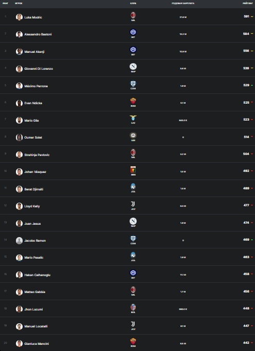 Вот, например, рейтинг лучших игроков по игре в защите от CIES (16 октября). Рейтинг учитывал все отборы, перехваты, возвраты владения и единоборства на земле.