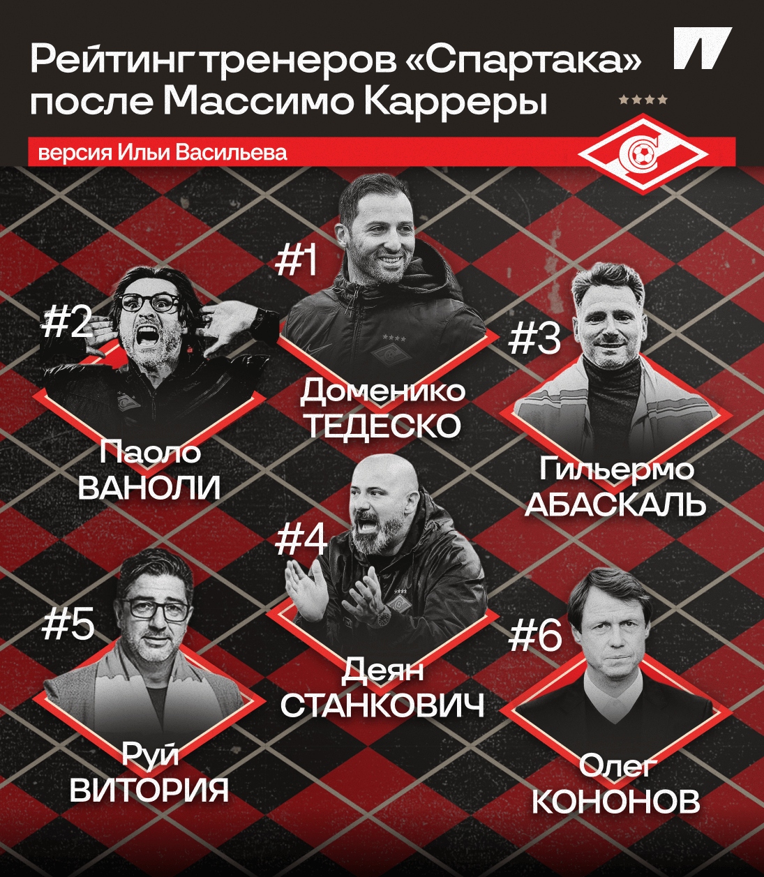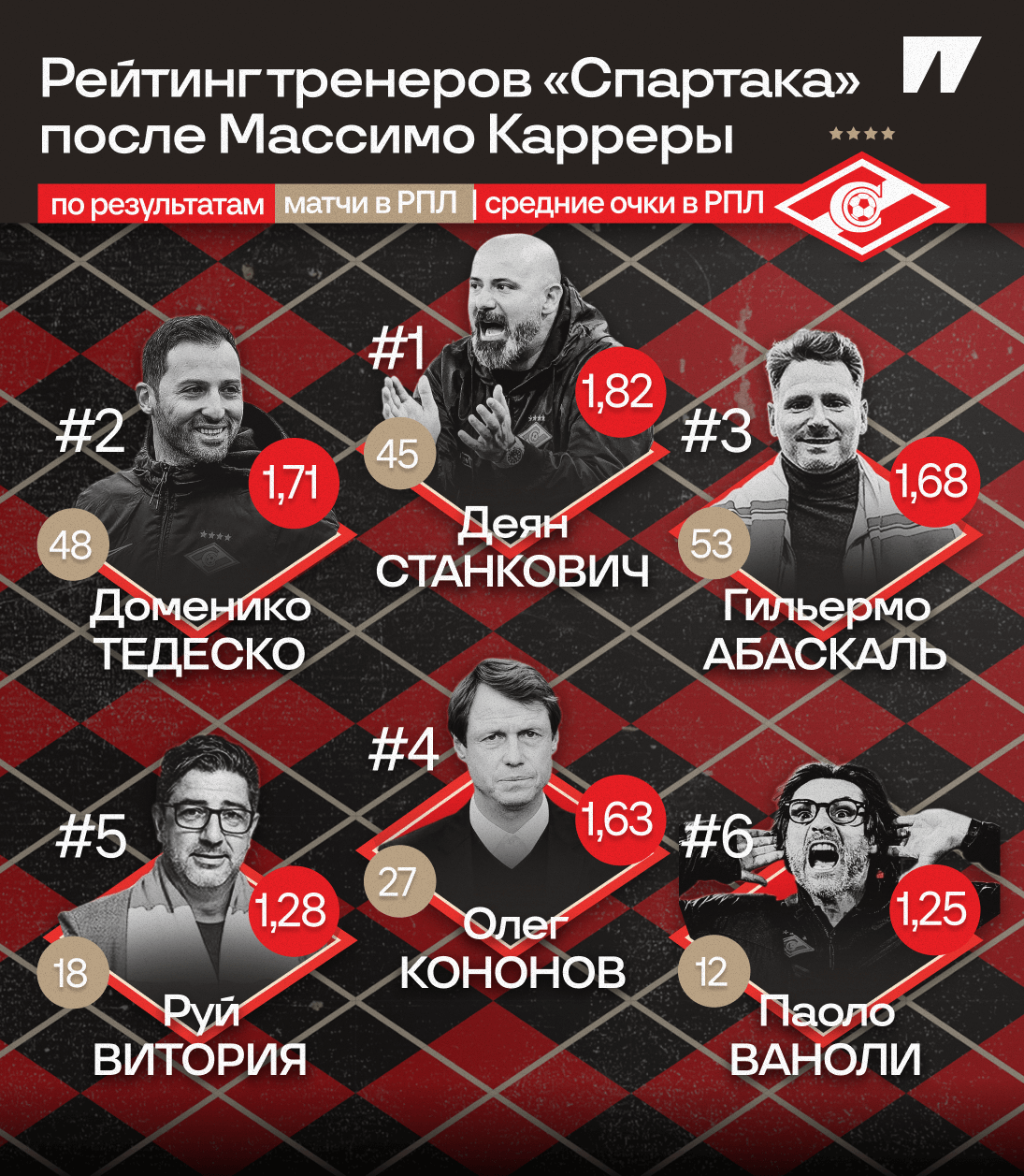 После Массимо Карреры, взявшего чемпионство в сезоне-2016/17, в «Спартаке» сменилось шестеро главных тренеров: Олег Кононов, Доменико Тедеско, Руй Витория, Паоло Ваноли, Гильермо Абаскаль и вот Деян Станкович.
