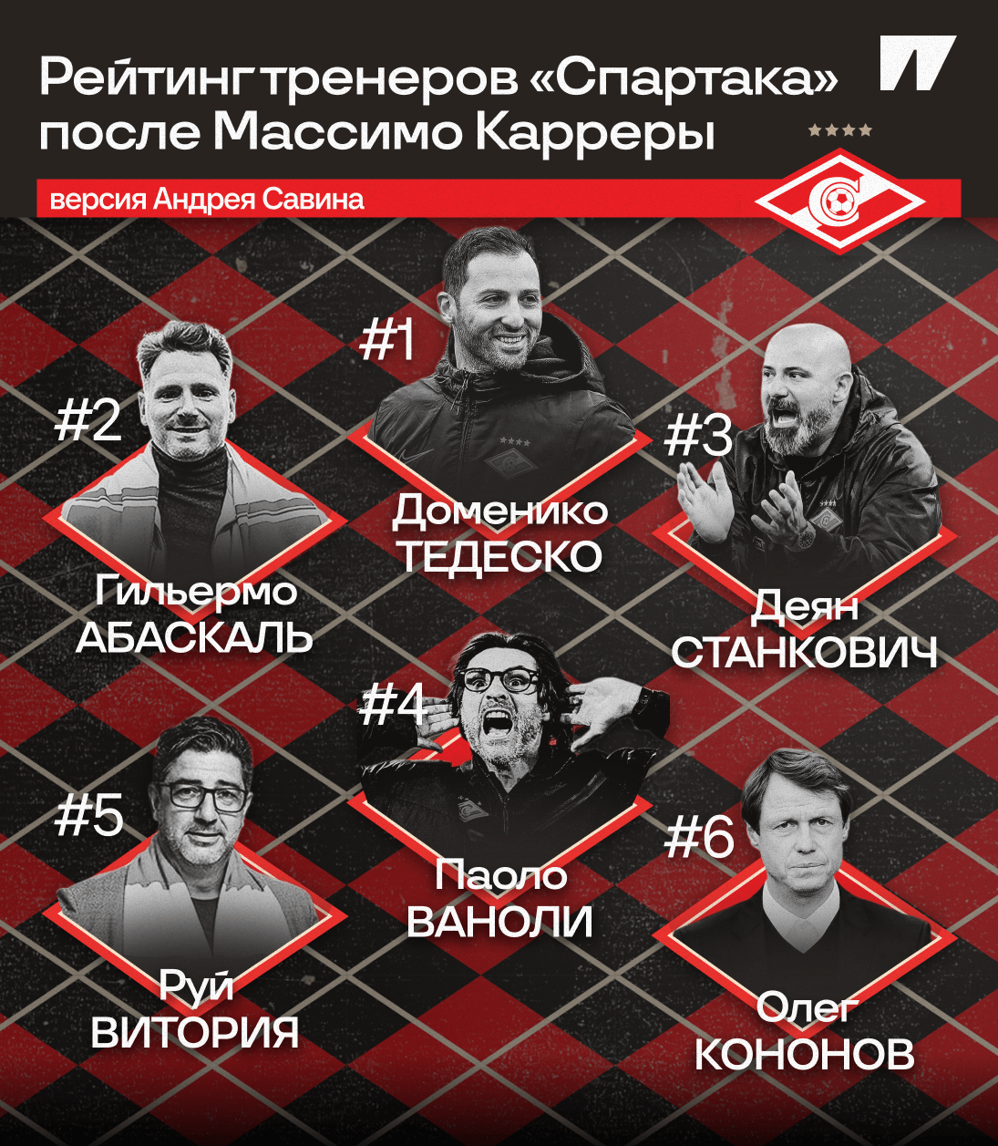 Абаскаль и Станкович – в топ-3, но это большая условность. Глобально они ближе к Кононову, чем к Тедеско. Среди этих двух для меня выше Абаскаль: больше качественных идей (яркий ромб на старте, эффективные 4-3-3 осенью-2022) при меньшем ресурсе.