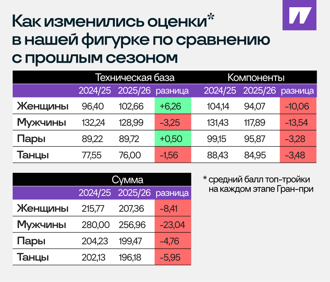 Чтобы разобраться в методах, которые наши судьи используют, выполняя требование ФФККР резать оценки, мы сравнили средние результаты фигуристов, попадавших в топ-3 на трех первых этапах Гран-при текущего и прошлого сезонов.