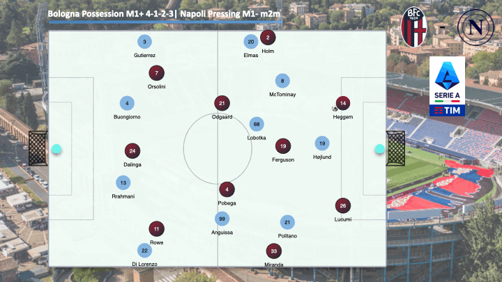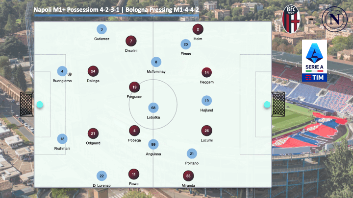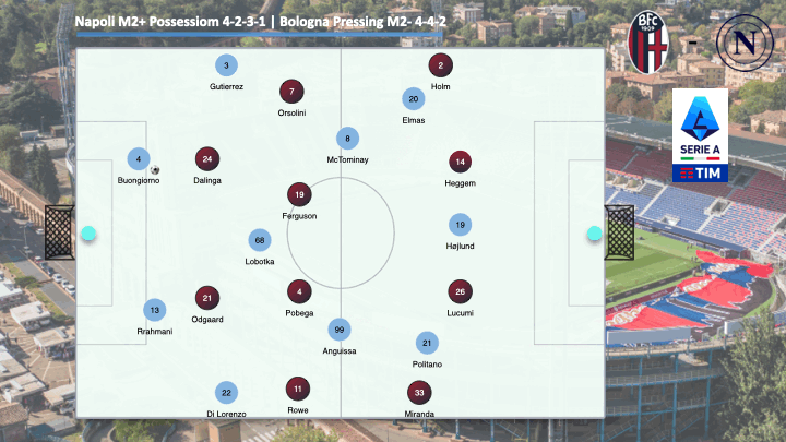Итальяно выстроил компактный и агрессивный 4-4-2, где фланговые полузащитники активно смещались внутрь, а Рове страховал опускающегося ниже Мактоминея. Даже когда Лоботка и Ангисса опускались глубже (почти на уровень линии обороны), продвижения по центру не было. Любой розыгрыш «Наполи» упирался в плотность блока и «Болонья» мгновенно возвращала структуру.