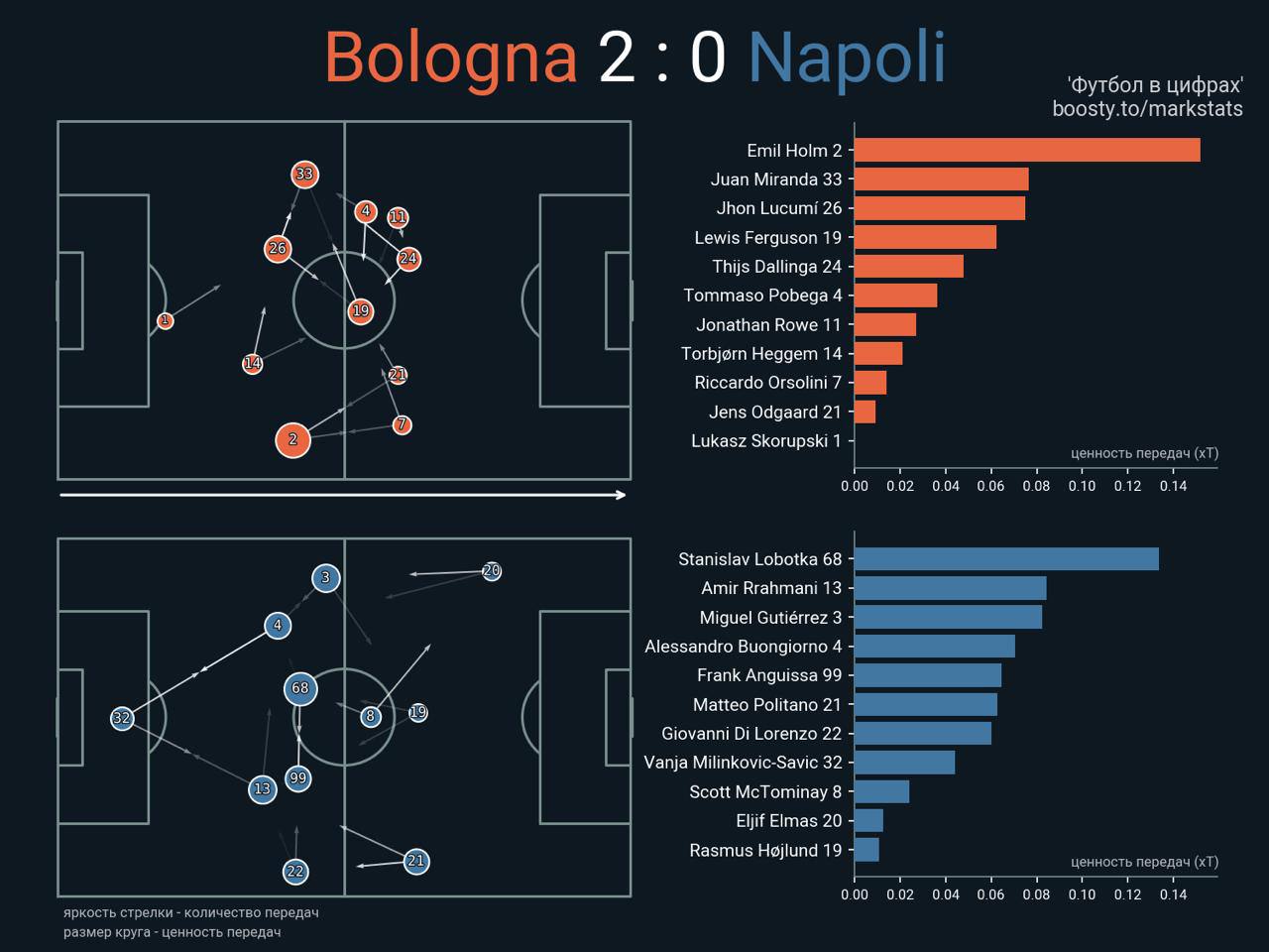 Команда Итальяно доминировала не числом передач, а осмысленностью. xG: 1.29 против 0.26, шесть ударов из штрафной против одного, три явных голевых момента против нуля — цифры не просто в пользу «Болоньи», они подчёркивают системность её игры. При меньшем владении и более низкой точности передач (78% против 83%), хозяева действовали быстрее, прямолинейнее (37.2% прогрессии против 34.5% у «Наполи») и рациональнее.