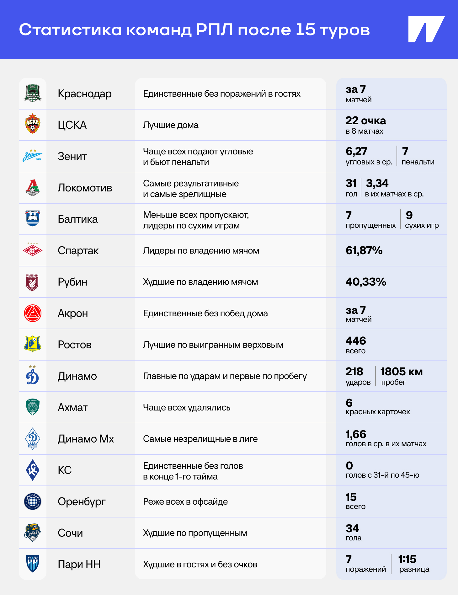 В Мир РПЛ завершился первый круг, у каждой из команд уже сформировались яркие показатели в статистике.
