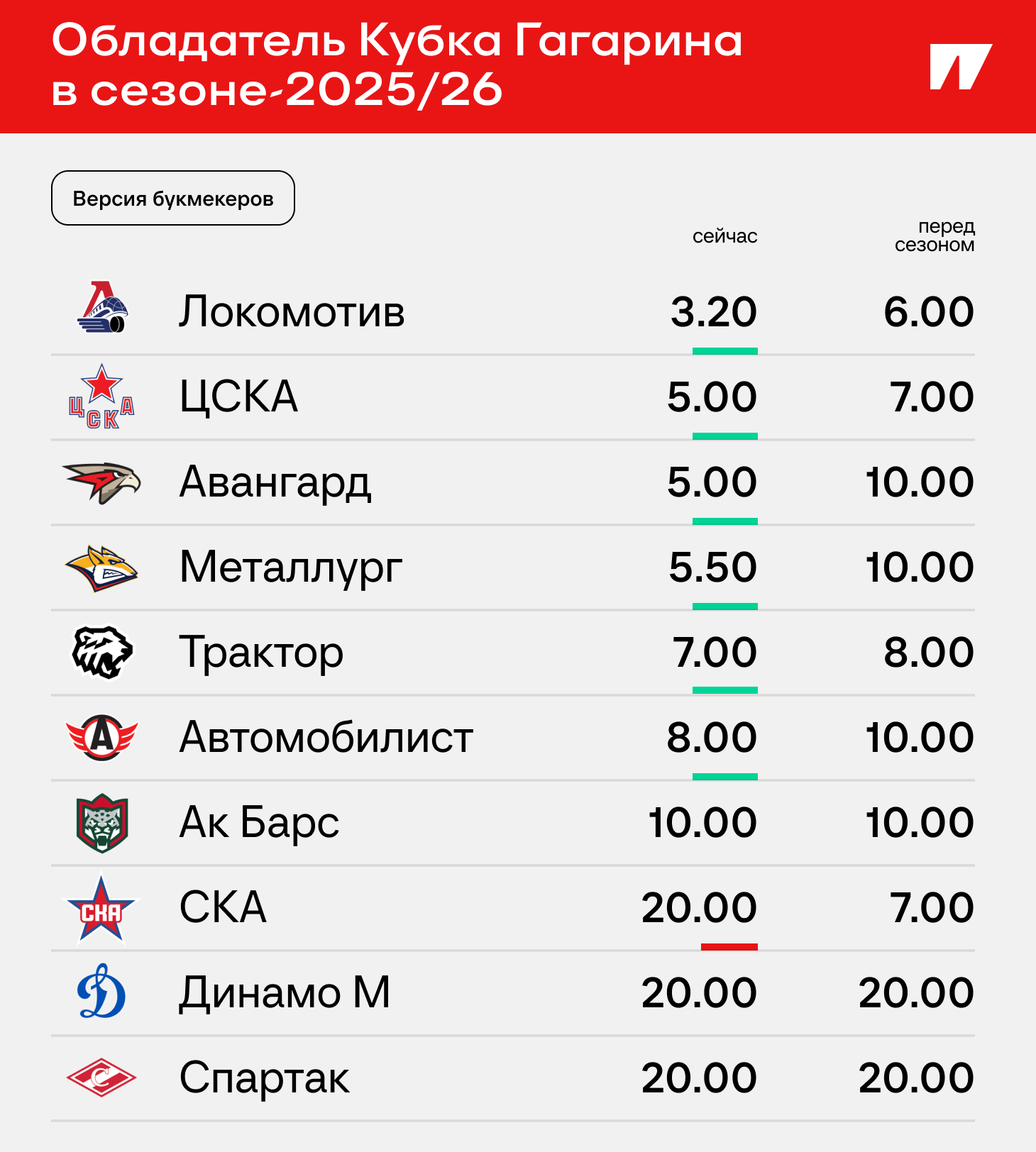 Шансы СКА и «Спартака» уже сравнялись, ЦСКА – все равно в топе фаворитов. Что в раскладах КХЛ