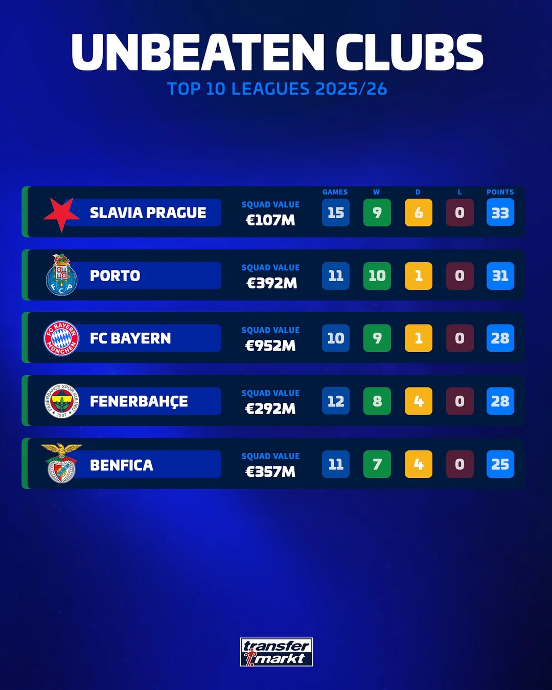 Осень близится к концу и футбольный сезон в Европе уже в разгаре. В топ-10 сильнейших чемпионатов континента осталось лишь пять команд, не знающих поражений. Любопытно, что две из них из одной лиги.