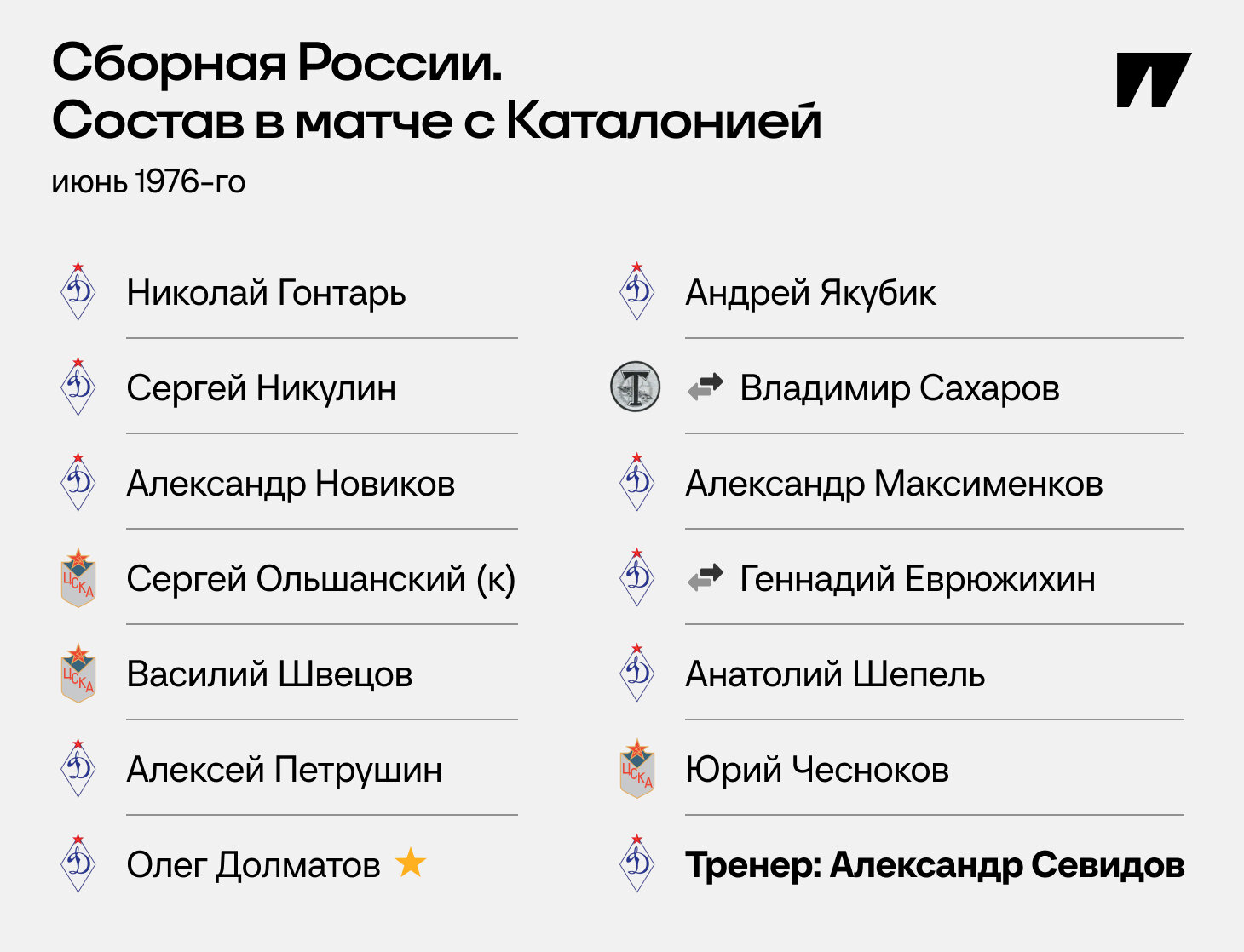 В некоторых источниках – и испанских, и наших – пишут, что играла сборная СССР. Это не так: в Каталонию приезжала сборная из футболистов московских клубов, ее для удобства там назвали «сборной России». Именно так писали на табло «Камп Ноу» и билетах. Хотя в приложении к «Советскому спорту» от 13 июня 1976-го говорили четко: сборная команда Москвы.