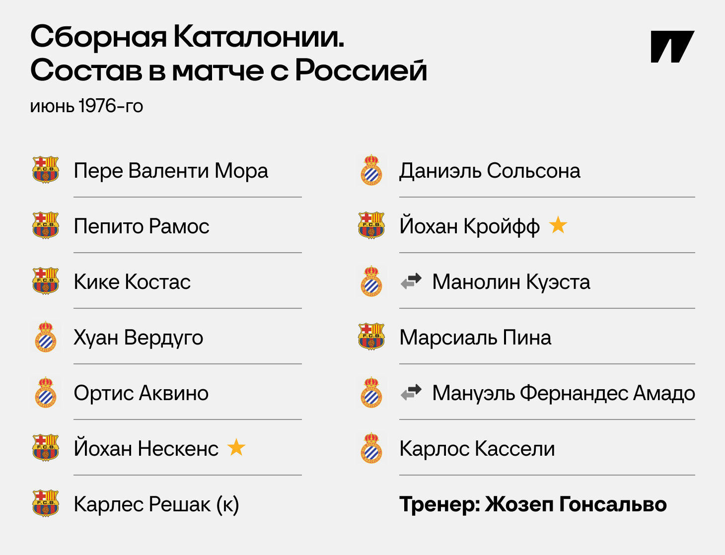 Сборную Каталонии собрали из футболистов «Барселоны» и «Эспаньола». Так как она не признана УЕФА и ФИФА, а в 70-е ограничений было меньше, вызывать при желании можно было любого, кто играет на территории Испании – без привязки к национальности. Хотя предпочитали все же местных. Великие голландцы Йохан Кройфф и Йохан Нескенс тогда выступали за «Барсу», грех было не воспользоваться. Лишь с 1997-го за Каталонию играют исключительно этнические каталонцы.