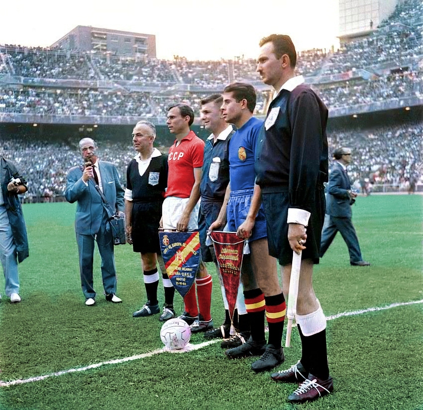 В общем, между СССР и Испанией была открытая вражда, столкновение идеологий левых и правых. Советские символы негласно запрещали. Хотя однажды пришлось сделать исключение: команды сыграли скандальный финал Евро-1964 на «Бернабеу», когда Испания стала чемпионом.
