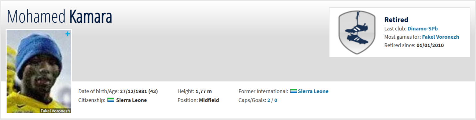 При этом вероятна и опечатка составителей страницы со статистикой футболиста, ведь если они «забили» на ведение информации по карьере игрока, на обновление количества его игр за «Каллон» (везде по нулям), на данные о его путешествии в Россию, а вместо всего этого единственно лишь сфокусировались на его играх за сборную, то вполне можно ожидать просчётов и в других местах, как это, возможно, и случилось с датой рождения. К слову, даже рост Камары от источника к источнику разнится от 174 до 180 сантиметров. Поэтому не забываем о сообщении отечественной прессы, являющимся нашей опорой – игрок «Факела» единственный Мохамед Камара в сборной Сьерра-Леоне тех лет, а значит некоторые неточности можно отставить в сторону.