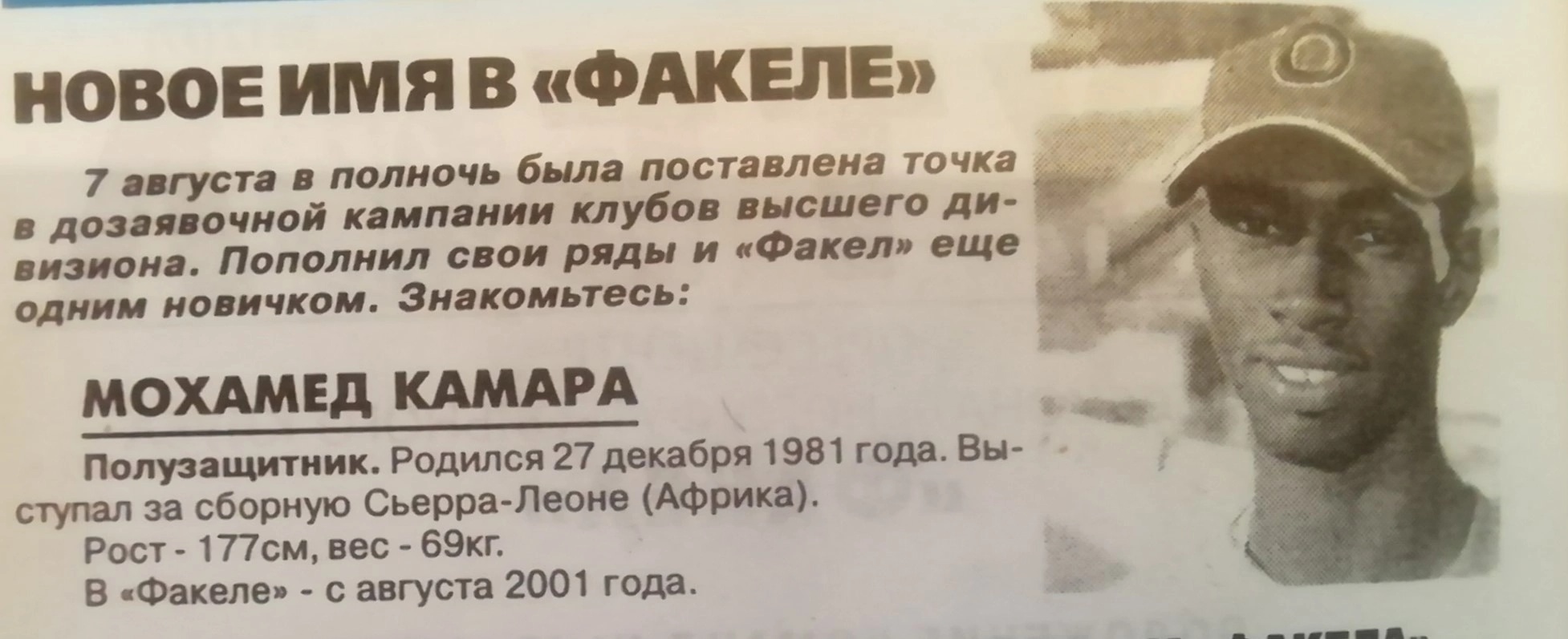 Когда Мохамед прилетел в Воронеж, его, как и любого иностранного профессионала, первыми встретили фотокамеры журналистов; однако по невыясненному стечению обстоятельств до нас дошли не просто обрывки – жалкие клочки визуальной информации. Существует единственное фото Камары, опубликованное в газете от 16 октября 2001 года. Оно помещено над заметкой о матче, в котором футболист дебютировал, и (обратите на это внимание!) само сообщение практически полностью посвящено игроку. Похоже тогда на него возлагали большие надежды – намного бо́льшие, чем мы можем представить себе сейчас.