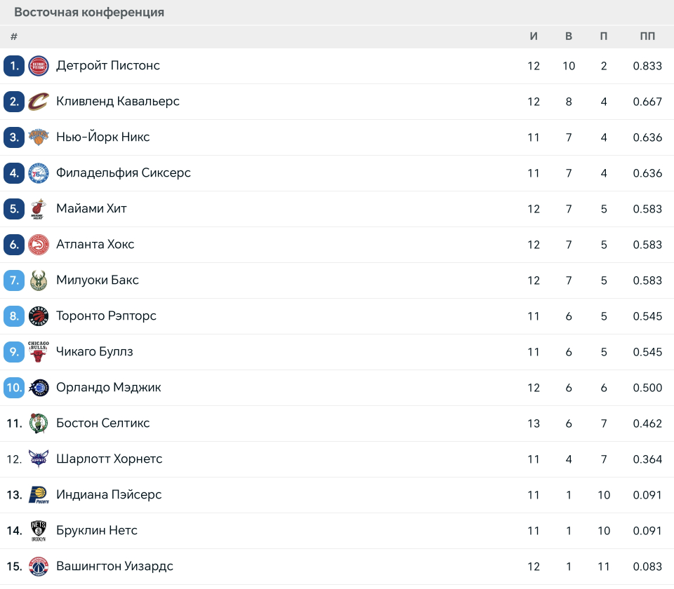 Ужасное начало сезона для команды финалиста прошлого сезона. Скорее всего, «Пэйсерс» в прошлом году прыгнули «выше головы», и в этом году повторения результата не стоит ждать. Во многом такая игра команды является следствием травмы их главного игрока - Халибертона. Все любители баскетбола ждут его возвращения. Команде не хватает его креативности в пасах и решающих бросках. А в его отсутствие, команду за собой ведёт Сиакам. Если смотреть индивидуальную статистику, то вроде бы всё хорошо, но пока что он не может приносить победы в одиночку. Остальные пытаются ему помочь, но, к сожалению, у них не сильно получается.