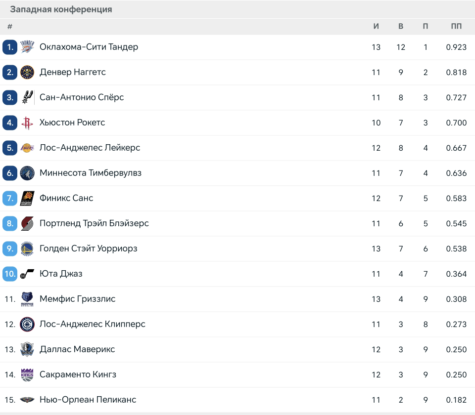 Чемпионское начало сезона. Оклахома выиграла в первых восьми матчах. Огорчить чемпионов смог Портленд в девятом туре (121:119). Главный игрок команды, Гилджес-Александер, МВП прошлого сезона. Он ударно начинает сезон, в среднем набирая 33 очка и 6 передач. Хочется подметить, сколько Шай бросил штрафных бросков против Индианы, целых 26 попыток, забросил 23. Очень нравится в начале сезона Хартенштайн, он забирает много подборов и помогает в атаке своими действиями. Второй звездой утверждается Холмгрен. Он часто «берет» игру на себя, и у него получается. У команды хорошие шансы на вторую победу в чемпионате подряд. Очень много таланта, они молодые, и эта организация еще много лет должна быть одним из главных претендентов на титул.