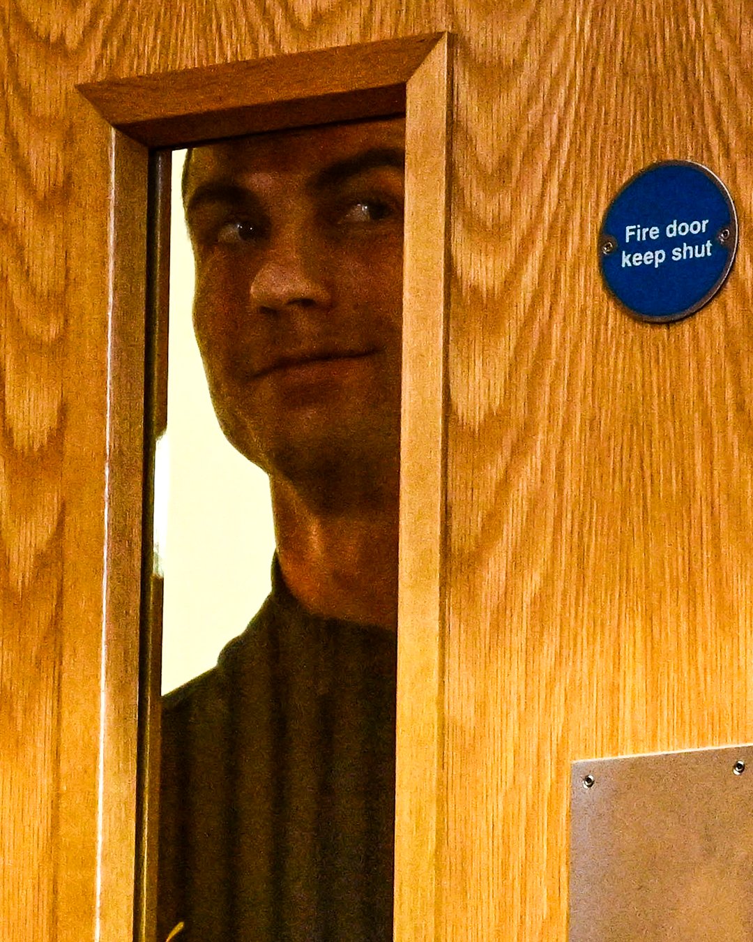 Разглядывал собравшихся журналистов, стоя за дверью зала для прессы.